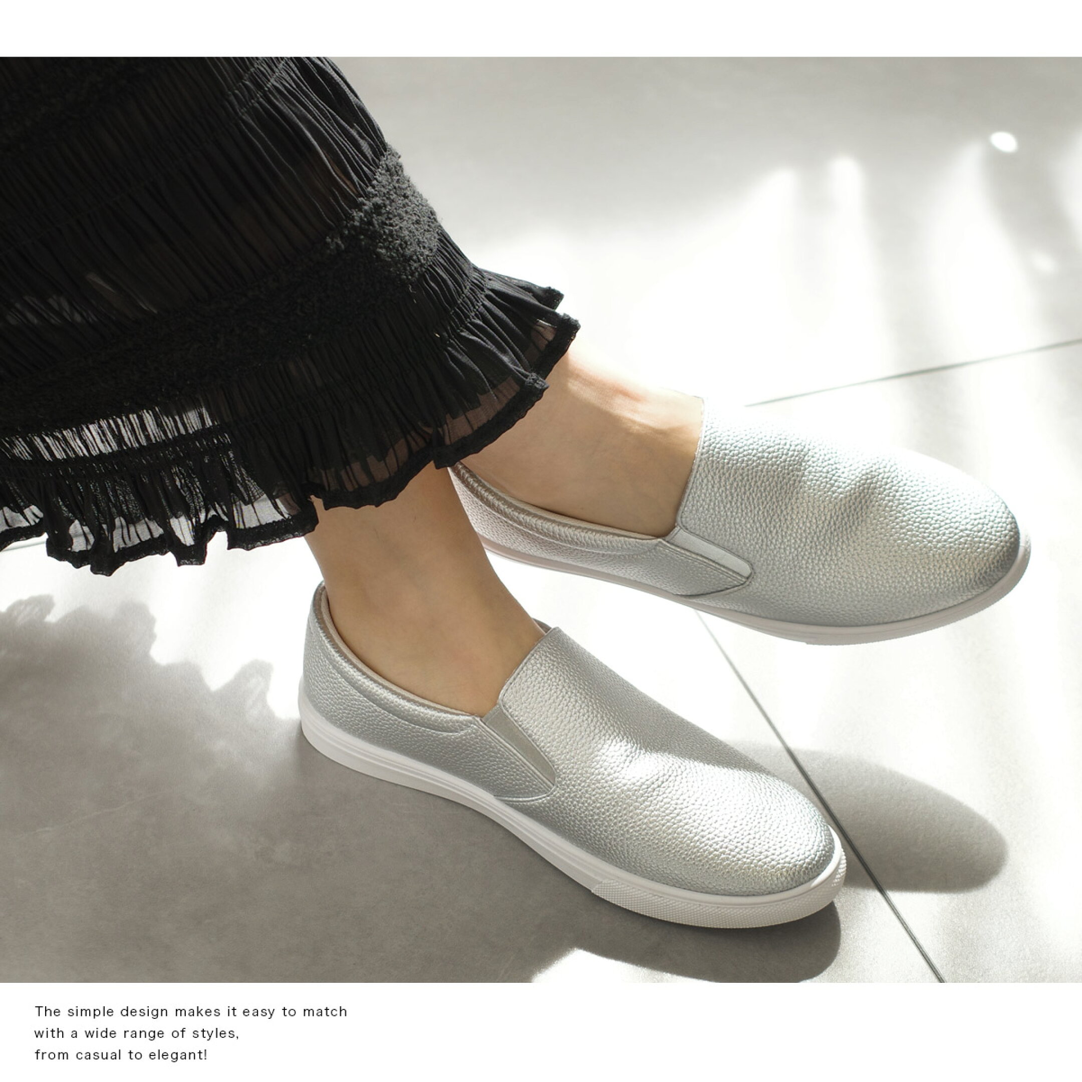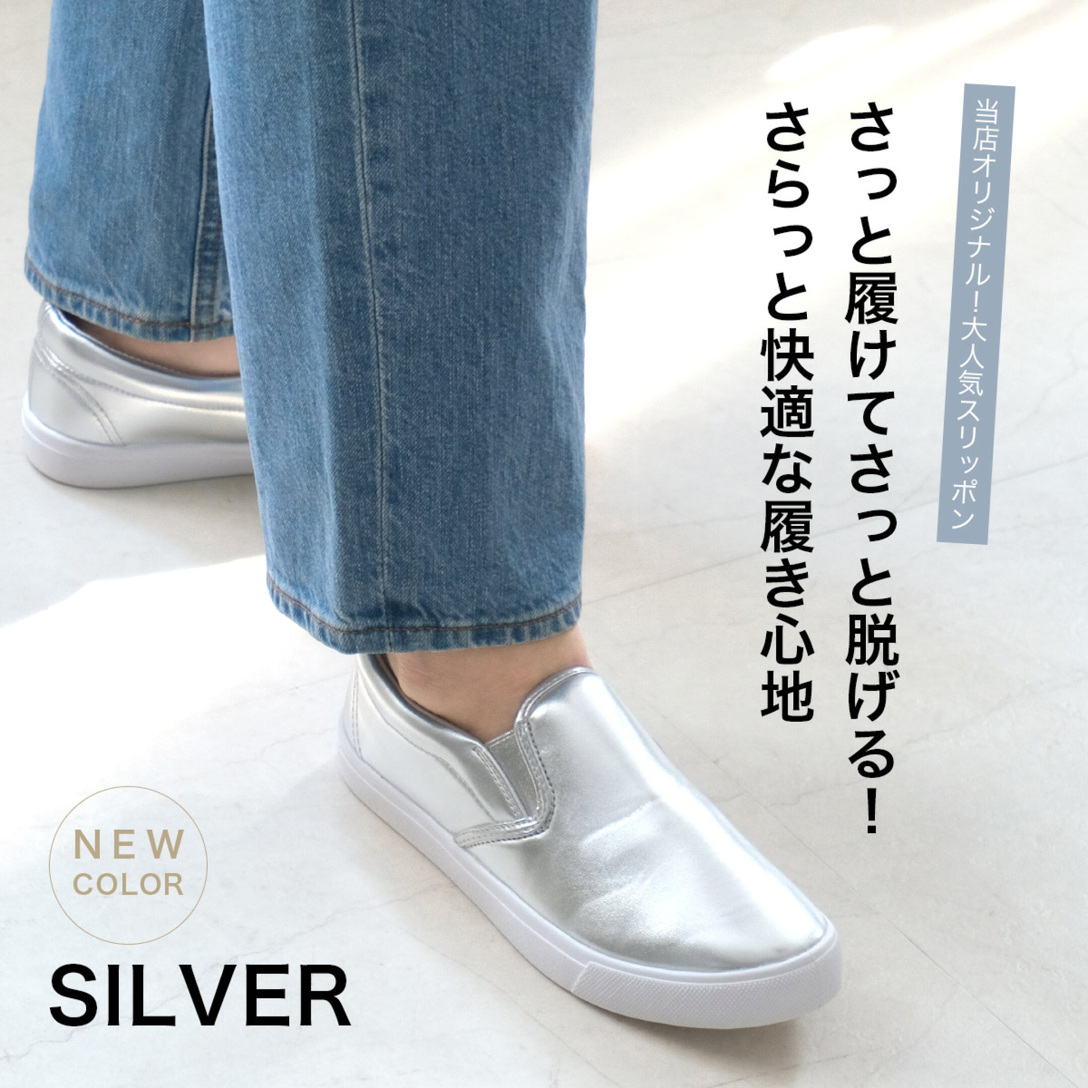 スリッポンの最大の魅力は、なんといっても「脱ぎ履きのしやすさ」。靴ひもやバックルがないので、サッと足を入れるだけでOK! スニーカーのような快適さを持ちながら、デザイン次第で“きれいめカジュアル”にも“抜け感のある大人コーデ”にもマッチするのがスリッポンの魅力。 選ぶ素材やカラーによって印象がガラリと変わるので、コーディネートの幅も広がります♪