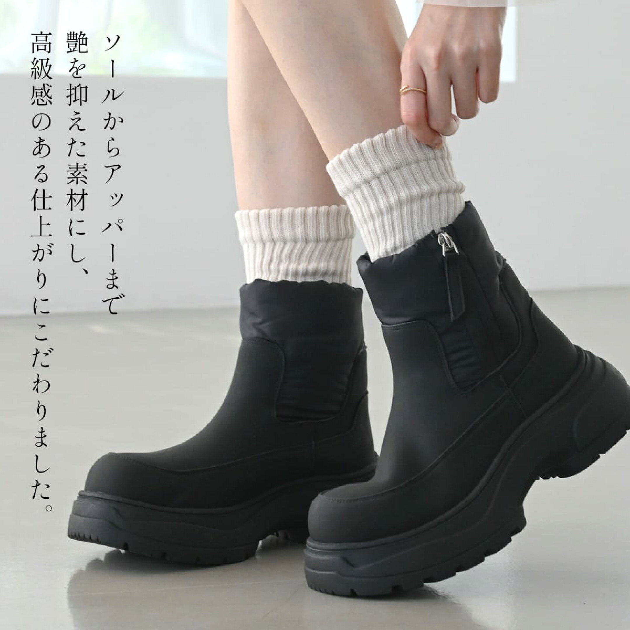 履き口を中綿にすることで、ショートブーツにありがちな足のすねの擦れを軽減し、ノンストレスな履き心地となりました。 高いデザイン製ながら撥水加工と防滑ソールで雪の日も対応! あえて艶を抑えた高級感のある仕上がりです。