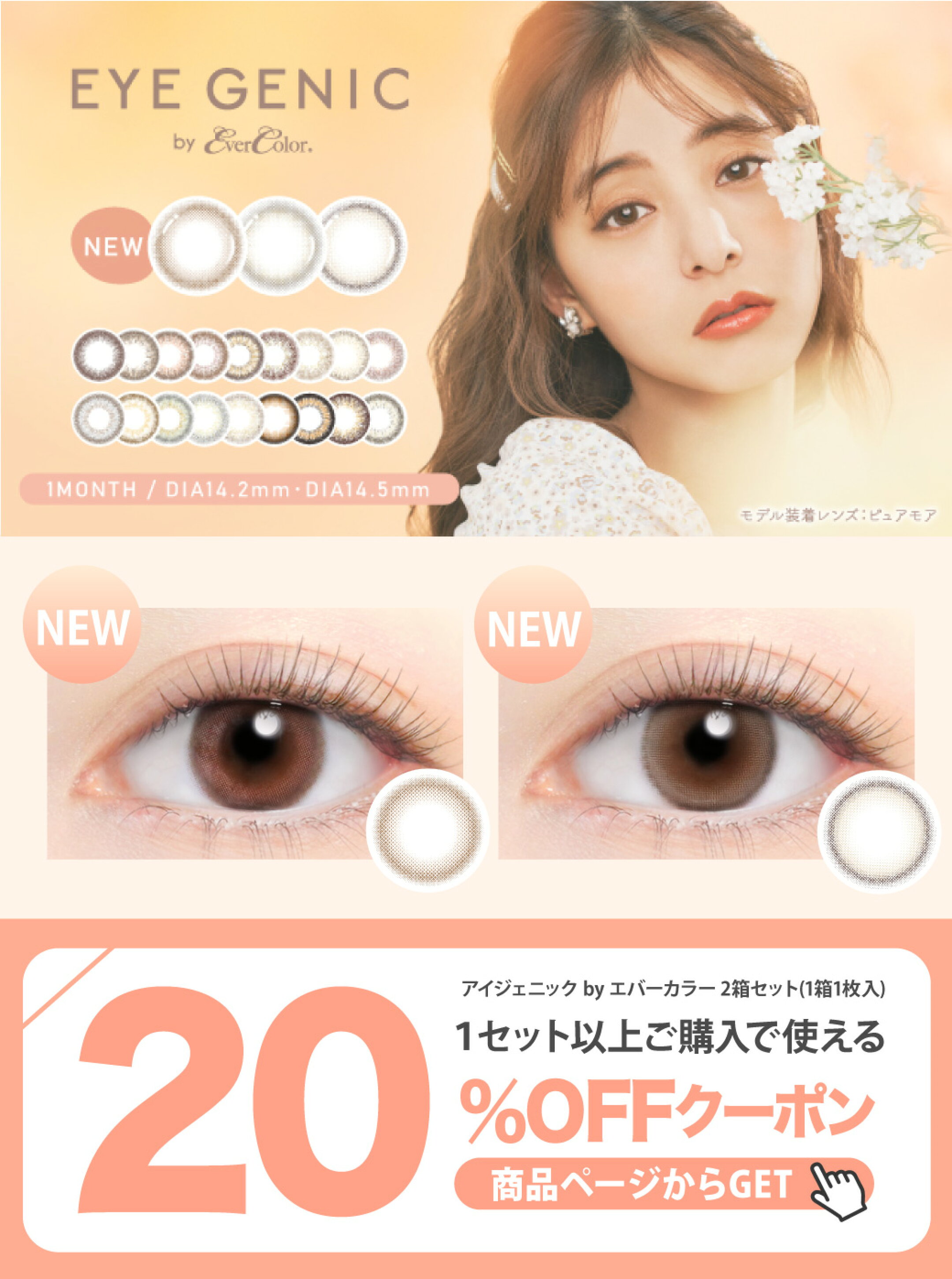 新色【20%OFFクーポン】カラコン 1ヶ月 アイジェニック バイ エバーカラー 度ありeye genic by ever color【2箱セット(1箱1枚入)】【メール便送料無料】カラコン 度あり 1ヶ月 14.5 ブラウン ピンク ナチュラル カラーコンタクト マンスリー エバカラ ∀