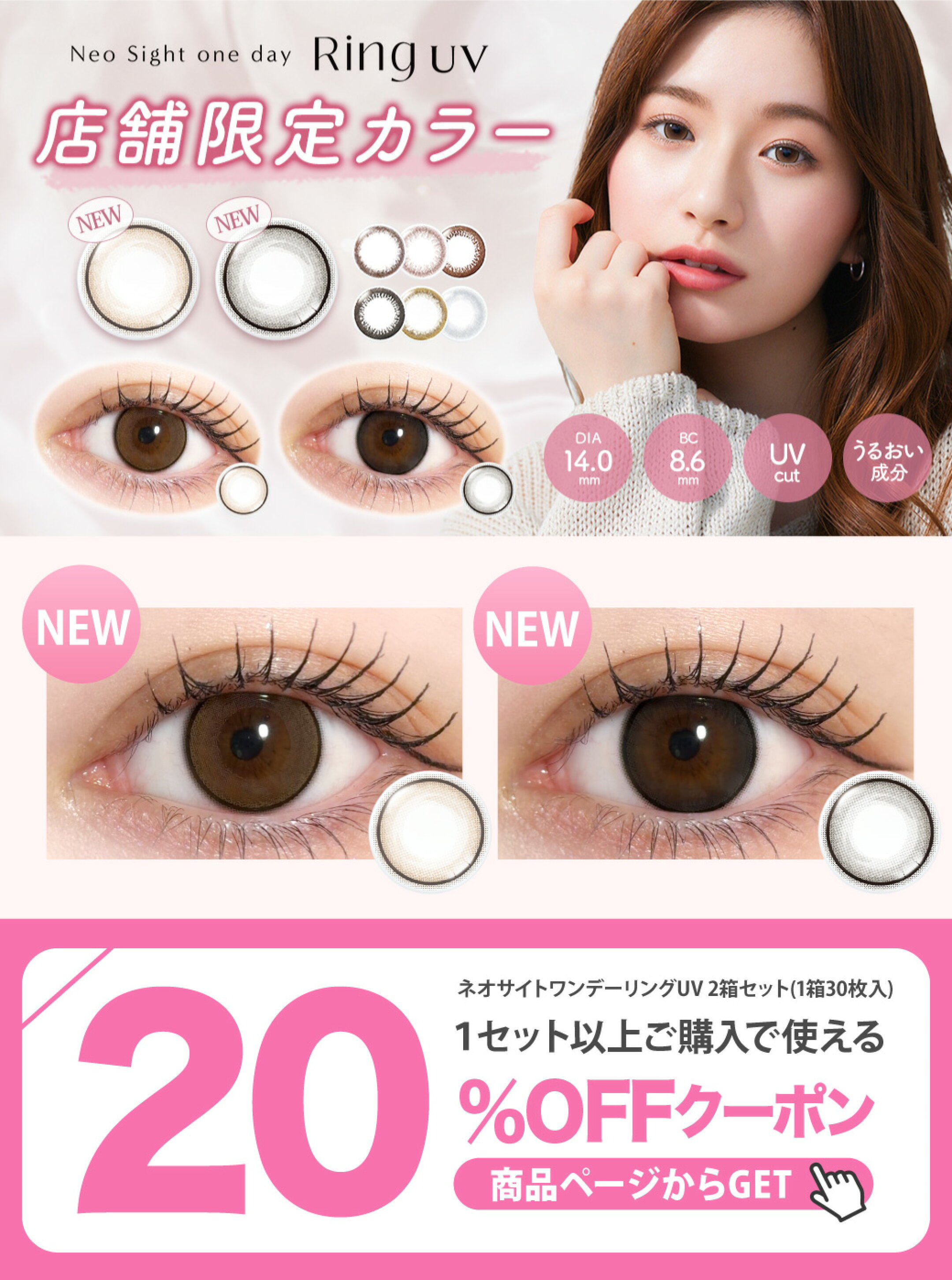 【店舗限定カラー】【20%OFFクーポン】新色 カラコン ワンデー ネオサイトワンデーリングUV (2箱60枚)【送料無料】【メール(ポスト投函)便選択で1配送につきパック1枚】 カラコン ワンデー 30枚入 度あり カラーコンタクト コンタクトレンズ 小さめ UV 奥目 ブラウン ∀