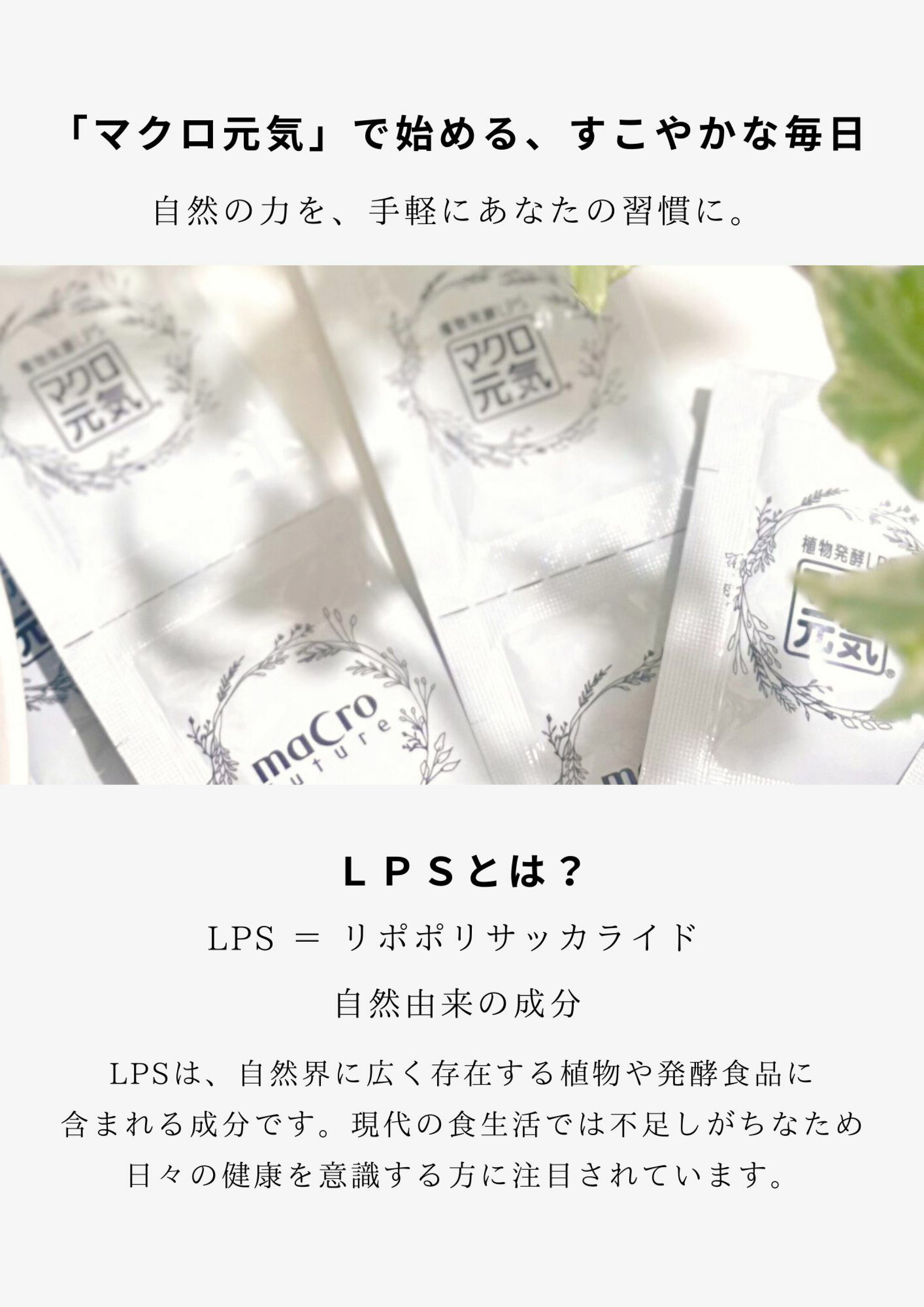 特許成分の自然由来で【安心・安全】な健康・美容成分 植物発酵LPS【リポポリサッカライド(通称:エルピーエス) ■自然免疫応用技研(株)純正素材 高濃度配合サプリメントのマクロ元気シリーズです。 食べる健康・美容サプリ!