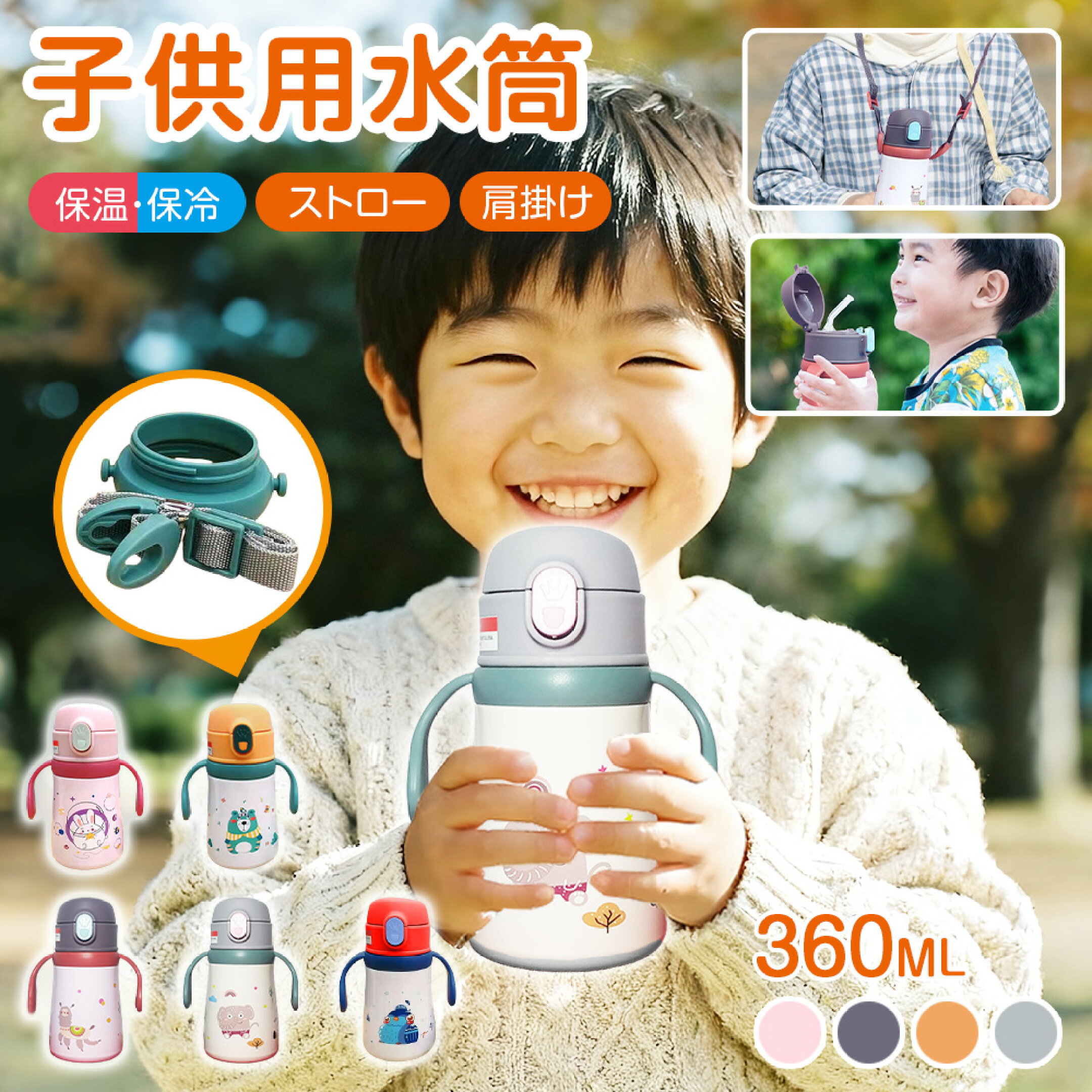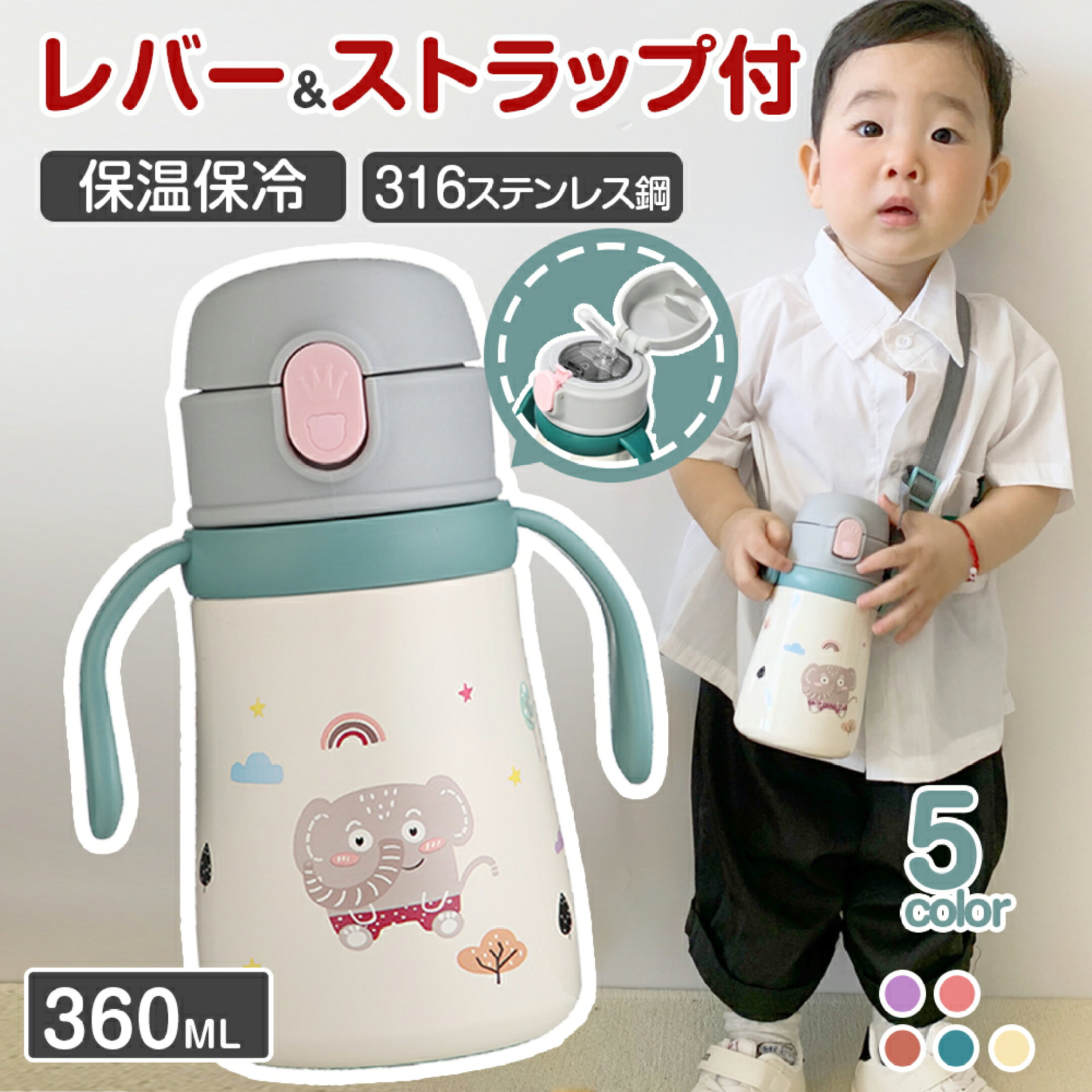 【クーポンで99円お得!】 2WAY 子供用 水筒 360ml ハンドル付きで+ショルダーベルトが付 水筒 キッズ ストロー 水筒 こども 子ども ストロー 魔法瓶 保温 保冷 大容量 軽量 通学 肩掛け 子供 直飲み 子供 持ちやすい 丈夫 特典付き 子育て 通園通学 かわいい 誕生日 ギフト