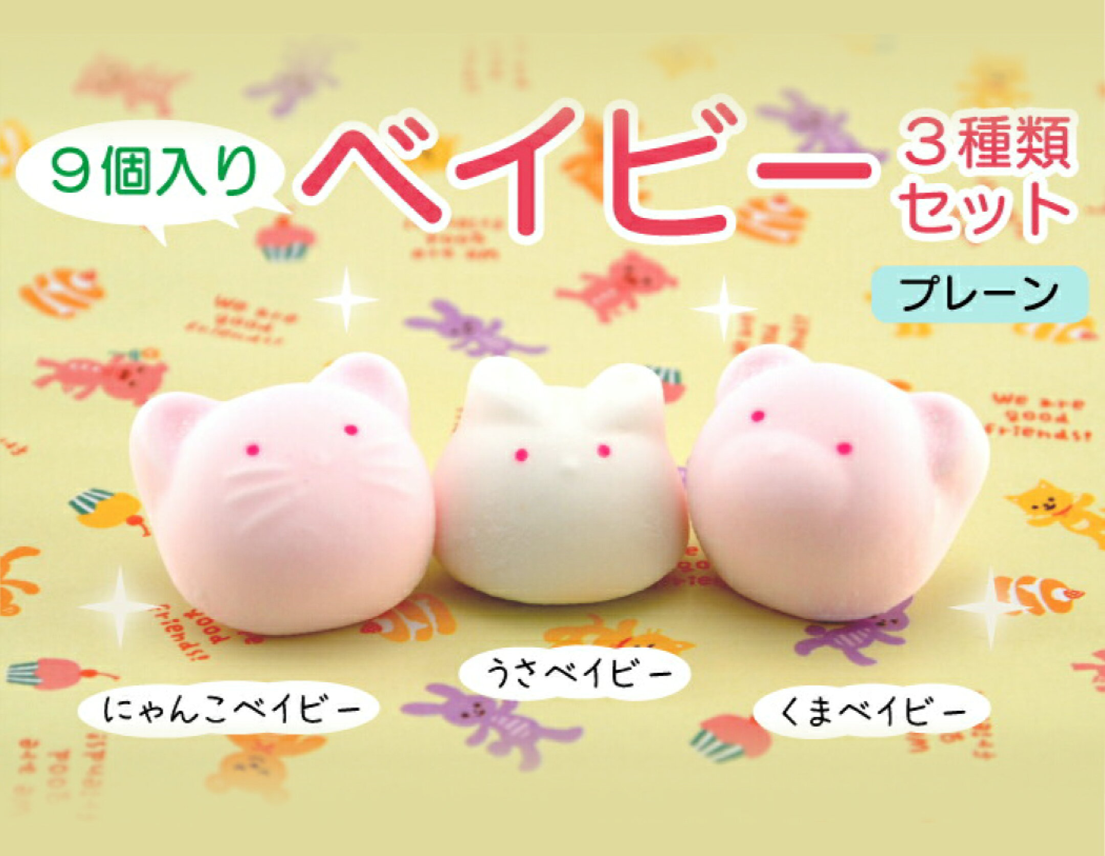 9個入りベイビー3種類セット可愛い かわいい 子供 子ども お菓子 マシュマロ プレーン味 プチギフト お祝い 感謝 動物 うさぎ くま ねこ ありがとう お礼 笑顔 スイーツ ギフト 誕生日 癒し プレゼント