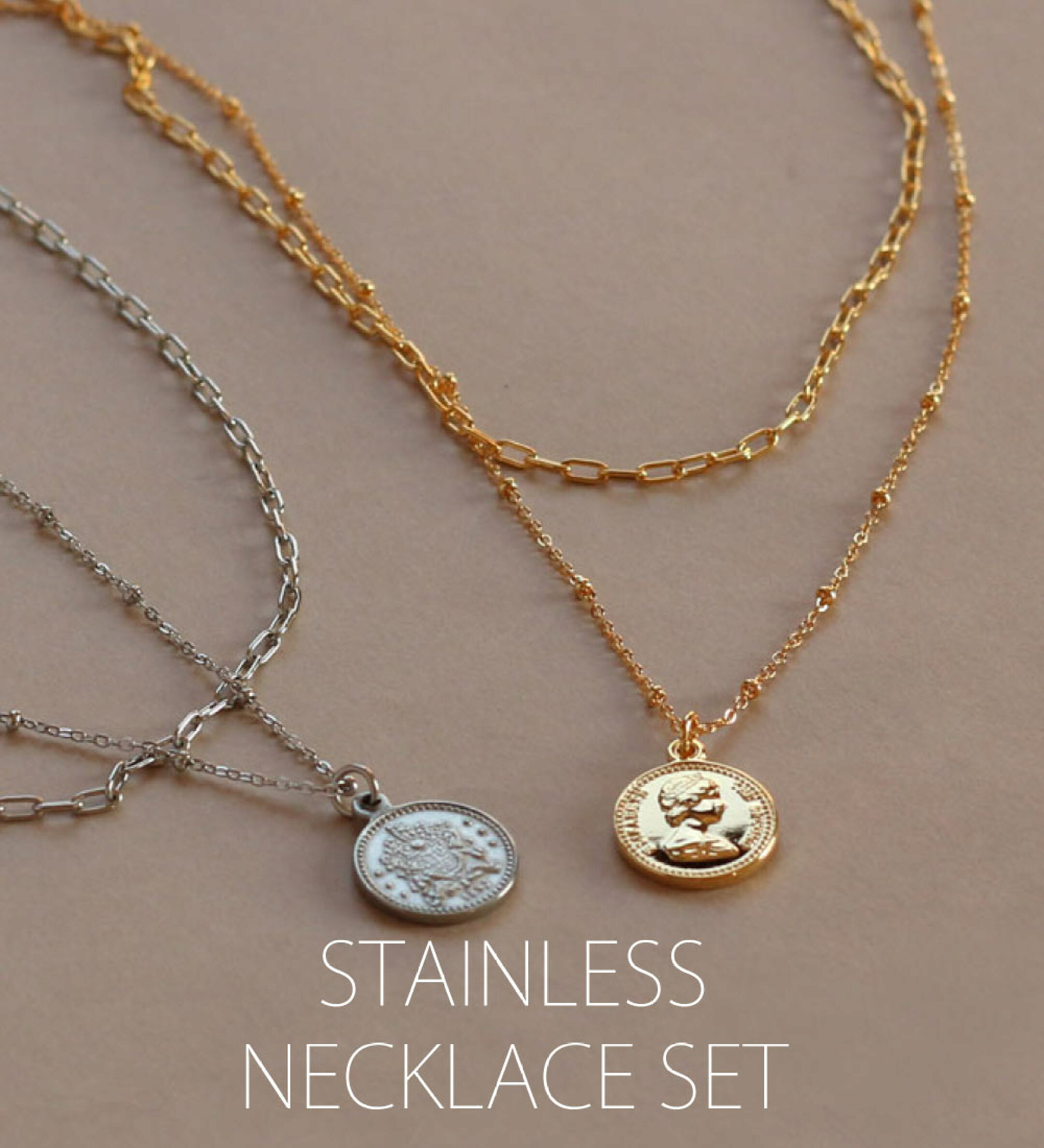 2本セット ネックレス ステンレス コインネックレス コイン 金属アレルギー対応 K18GP 重ね付け レディース ケーブルチェーン メタ シンプル 大人 アクセサリー