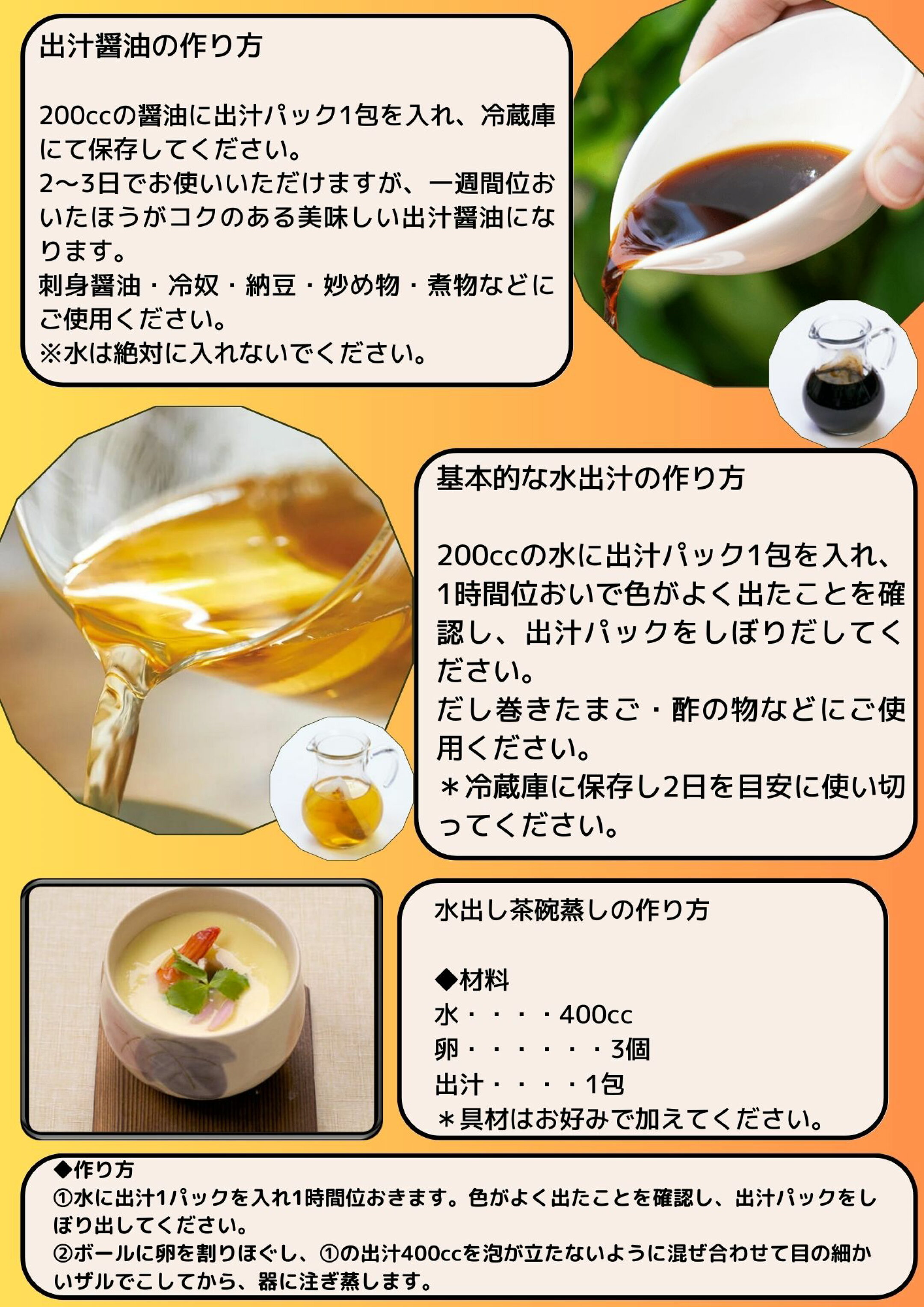 ■ポイント1、 本格和風だしの味わい 厳選素材を使用し、料亭のような深い旨みを手軽に再現できます。 ■ポイント2、 使いやすいだしパック ティーバッグ式で、誰でも簡単に本格だしを取れるのが魅力。 ■ポイント3、 化学調味料・保存料不使用 自然素材にこだわり、体にやさしく毎日安心して使える。 ■ポイント4、 料理の幅広さ お味噌汁、煮物、炊き込みご飯など、和食全般の味をワンランクアップ。 ■ポイント5、 ギフトにも最適 上質で贈り物にも喜ばれる人気商品。