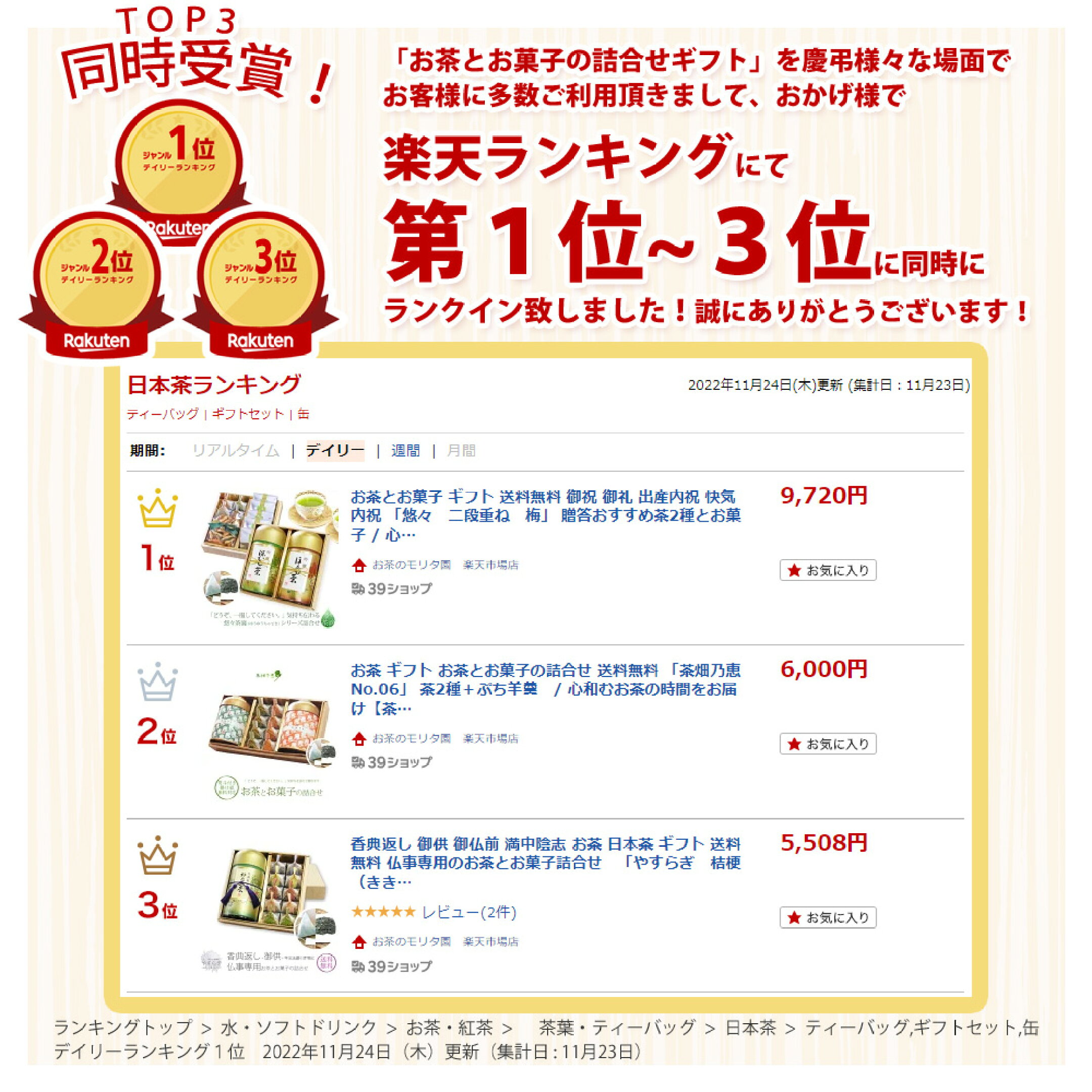 この度は当店のお茶とお菓子のギフトを見つけて頂き、誠にありがとうございました。商品レビューに★4評価+コメントを頂きまして、心より御礼申し上げます。 またの機会がございましたら、慶弔問わずご利用を心よりお待ちしております! (楽天市場店店長の森田より)