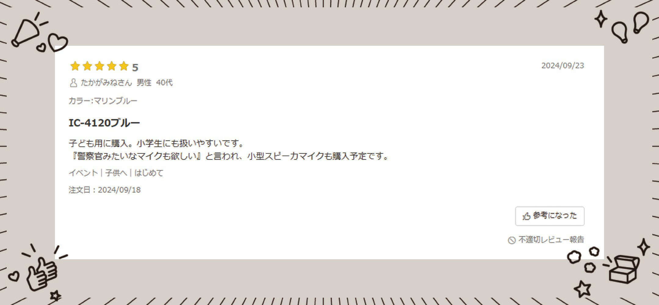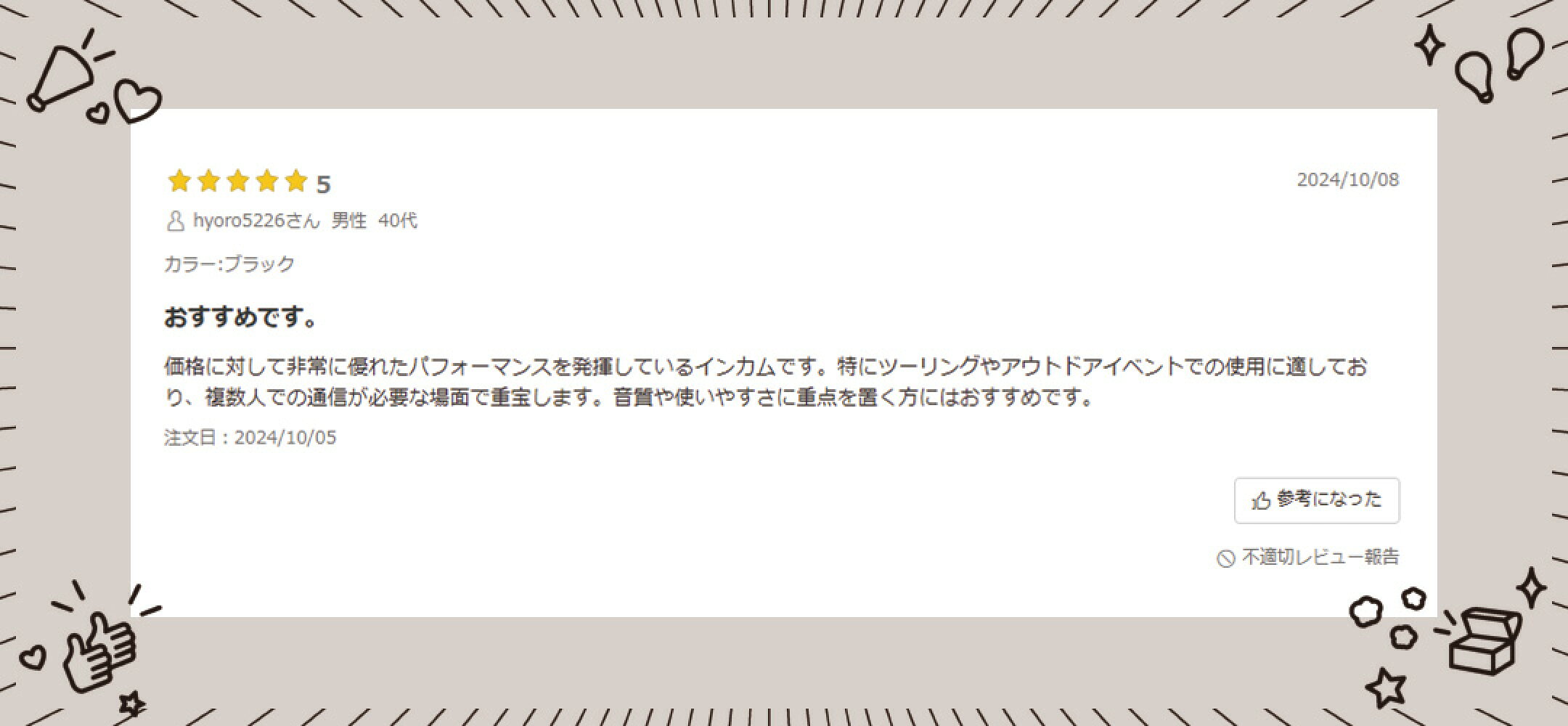 当店インカムダイレクト無線ショップで、 今までたくさんのお客様に支えられたと同時にたくさんのお声を頂いております! その中でも特に高評価を頂いている商品と、実際に頂いた嬉しいお言葉をご紹介いたします!