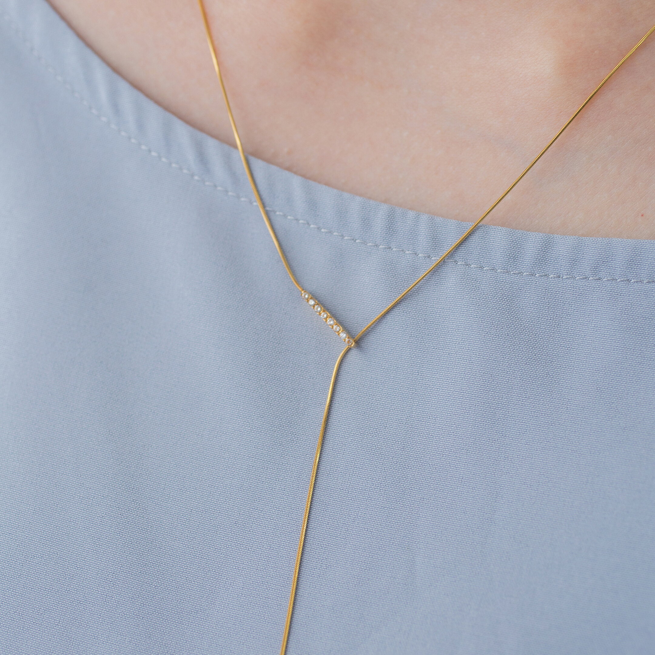 デートや食事会などの特別なシーンにふさわしい、エレガントで華やかさが魅力的なコーディネート。 デコルテを美しく見せるY字ネックレスは、煌めくキュービックがさりげなく輝き、顔周りを明るく演出します。 さらに、指には複数のリングを重ね付けすることで、手元に華やかさと奥行きをプラス。 リボンの形をしたピアスが、全体に可愛らしさを添えつつ、大人の女性らしいこなれた印象を与えます。 デザインや色味が統一された華奢なアクセサリーは、優美で上品な雰囲気を醸し出してくれます。