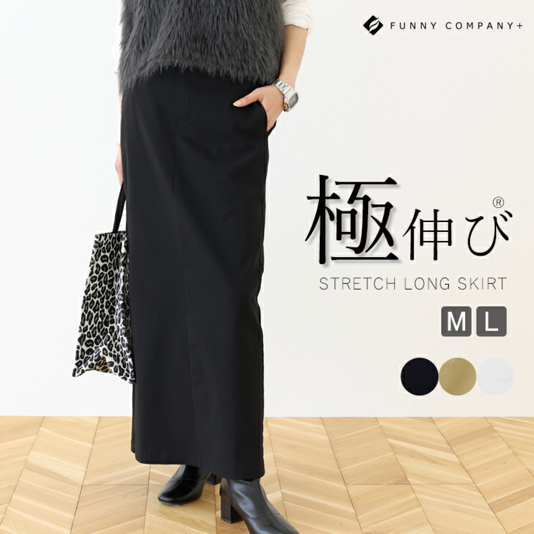 穿き心地の良さときちんと見えの両方が手に入る極伸び®スカート。 横にも斜めにもぐ~んと伸びる驚異の伸縮性で、どんな動きもスムーズ、ストレスゼロ。オンにもオフにも使いやすいIラインのロングシルエット、ウエストは全周ゴムになっているのでお腹周りに苦しさを与えません。MサイズとLサイズからお選びいただけます。