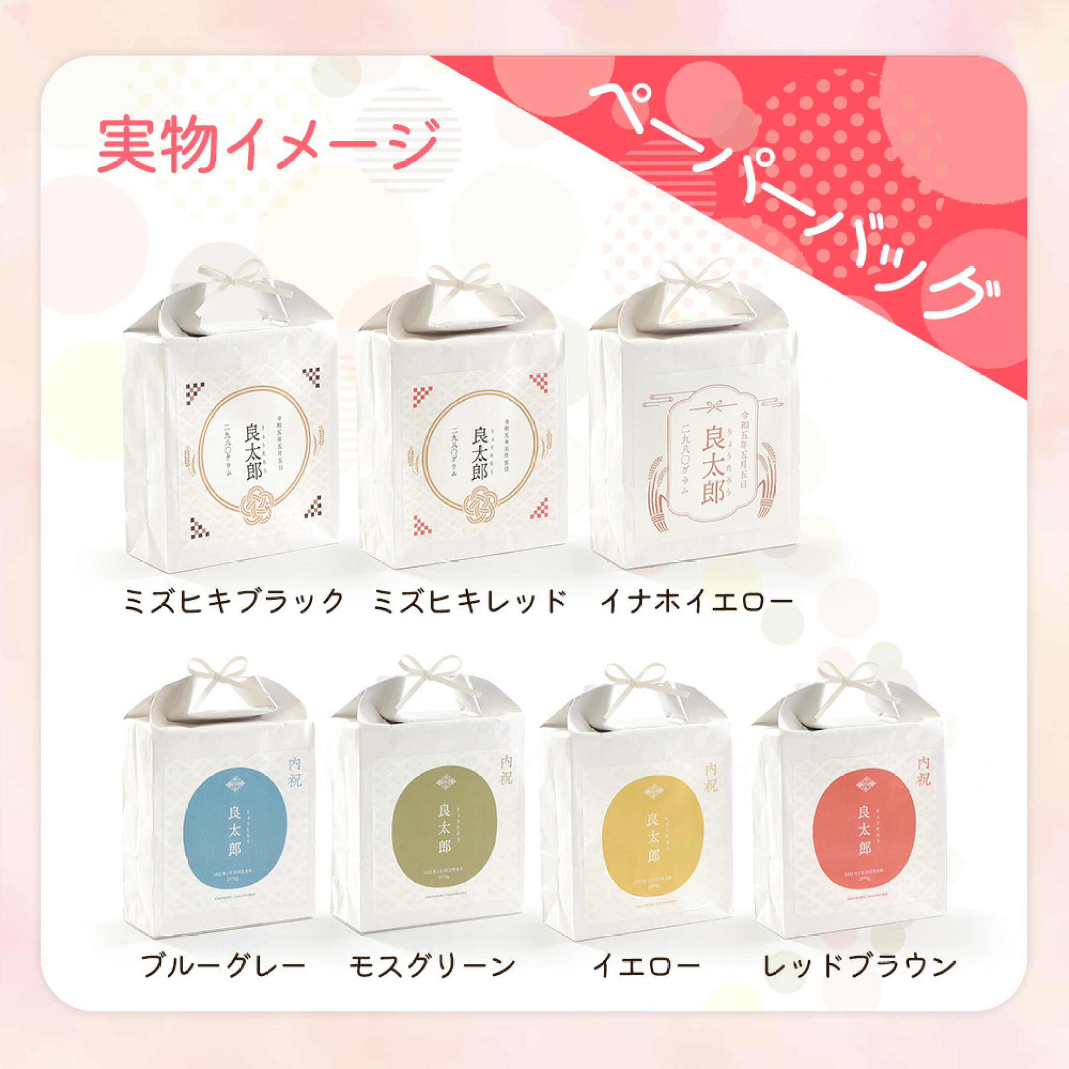 ● 名入れ可能な完全受注生産: ラベルや箱に、お名前・体重・生年月日を入れられます。 お米場 田心のオリジナルデザインから選べ、世界に一つだけの特別なパッケージに。 見た目も楽しめるうえ、大切な方への贈り物として喜びを共有し、家族の絆を深めます。 ご注文ごとに、一つひとつ丁寧にお作りします。