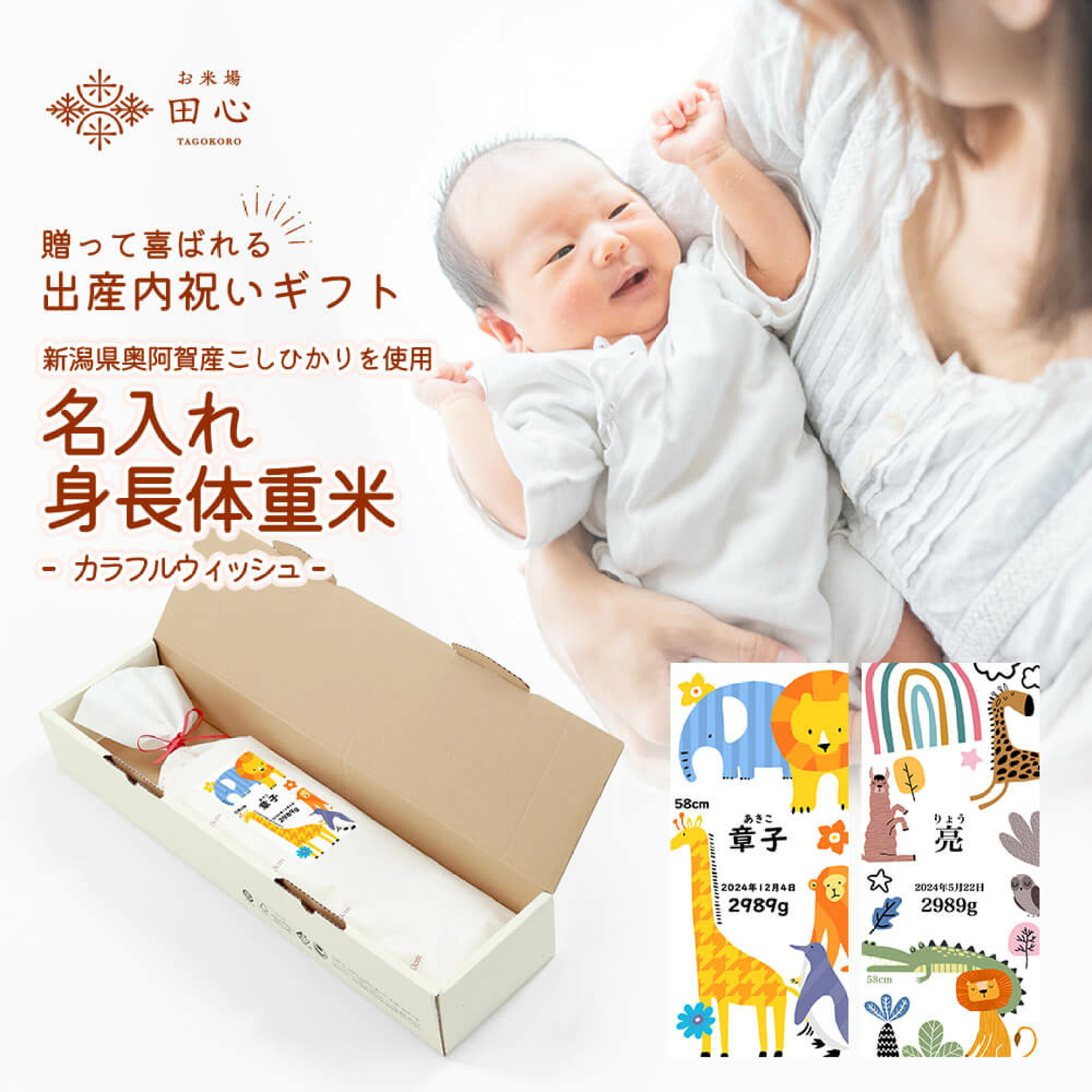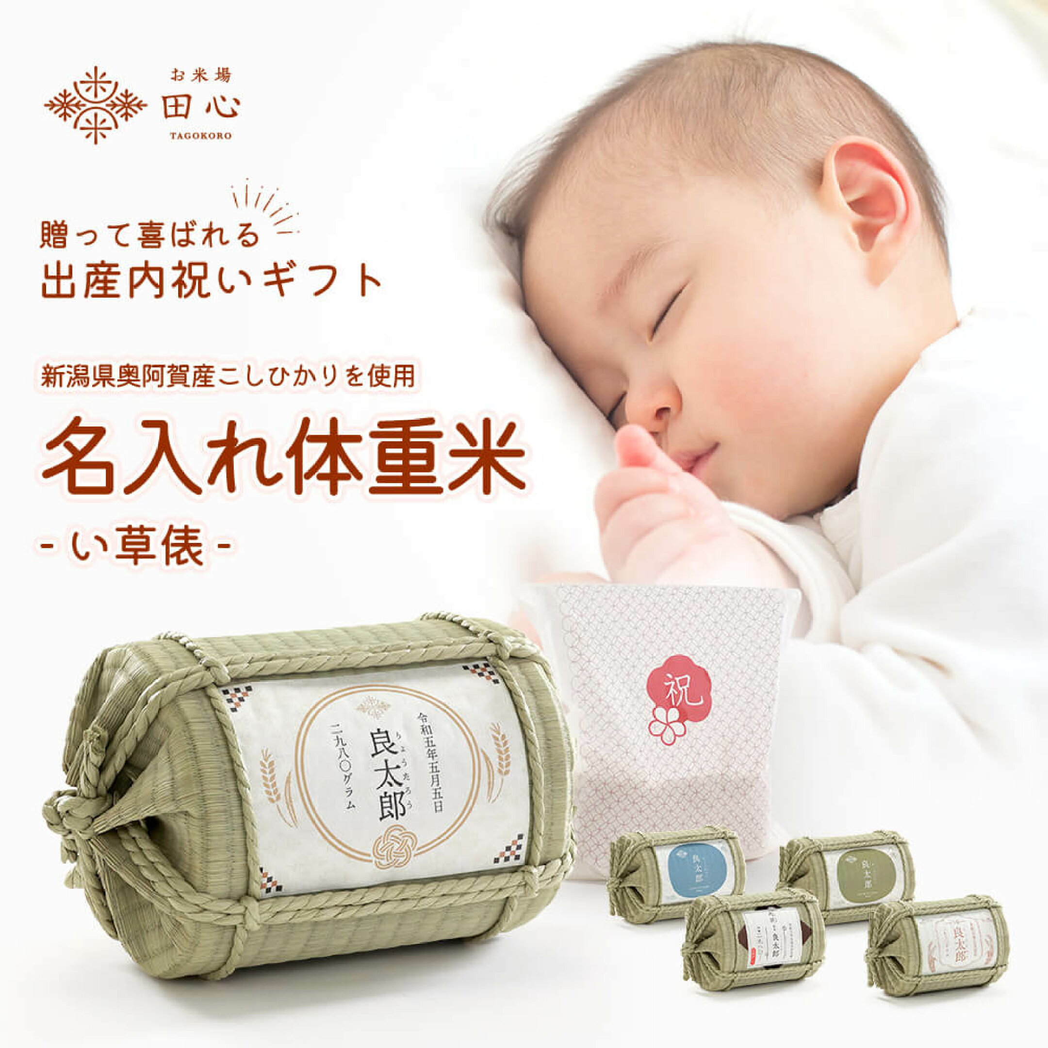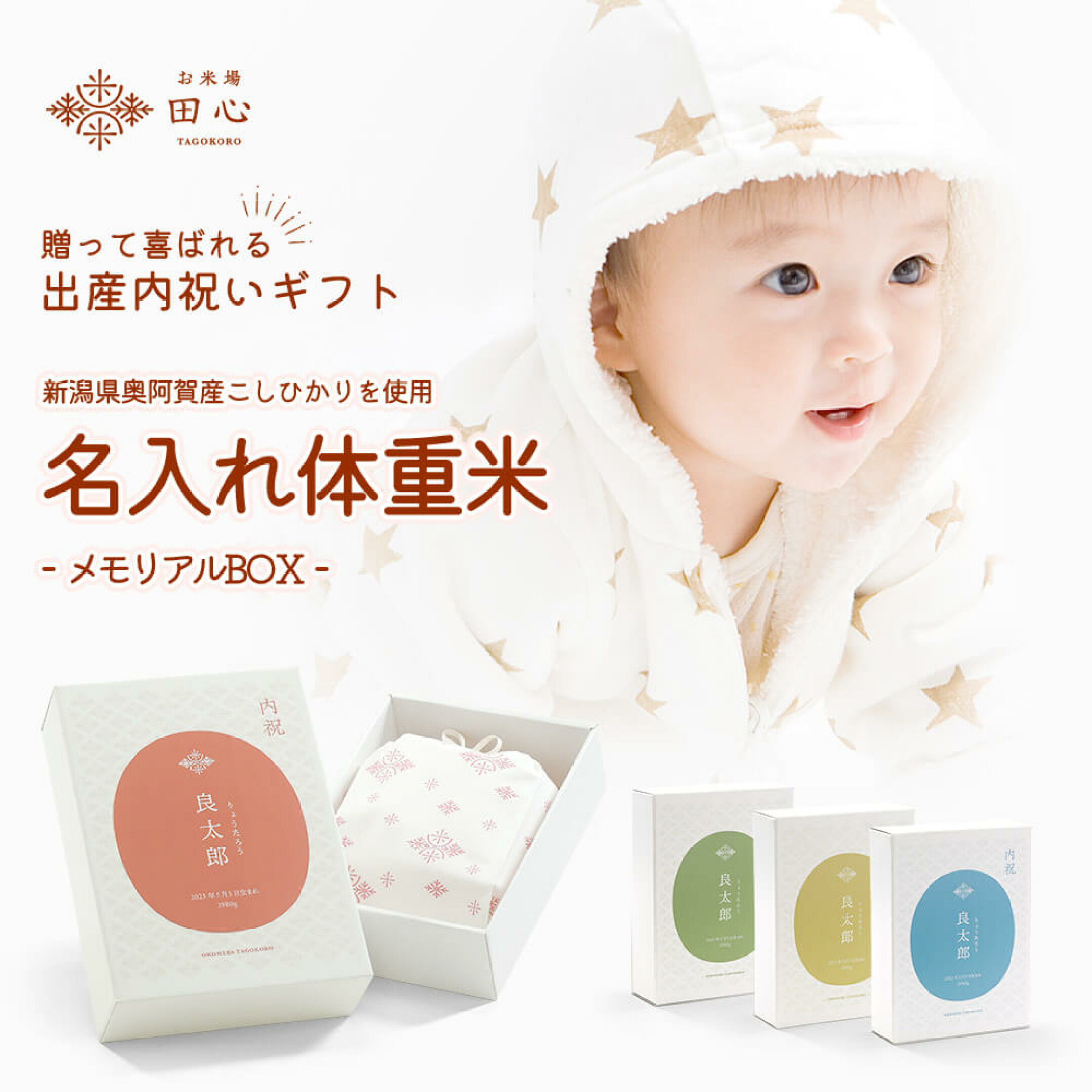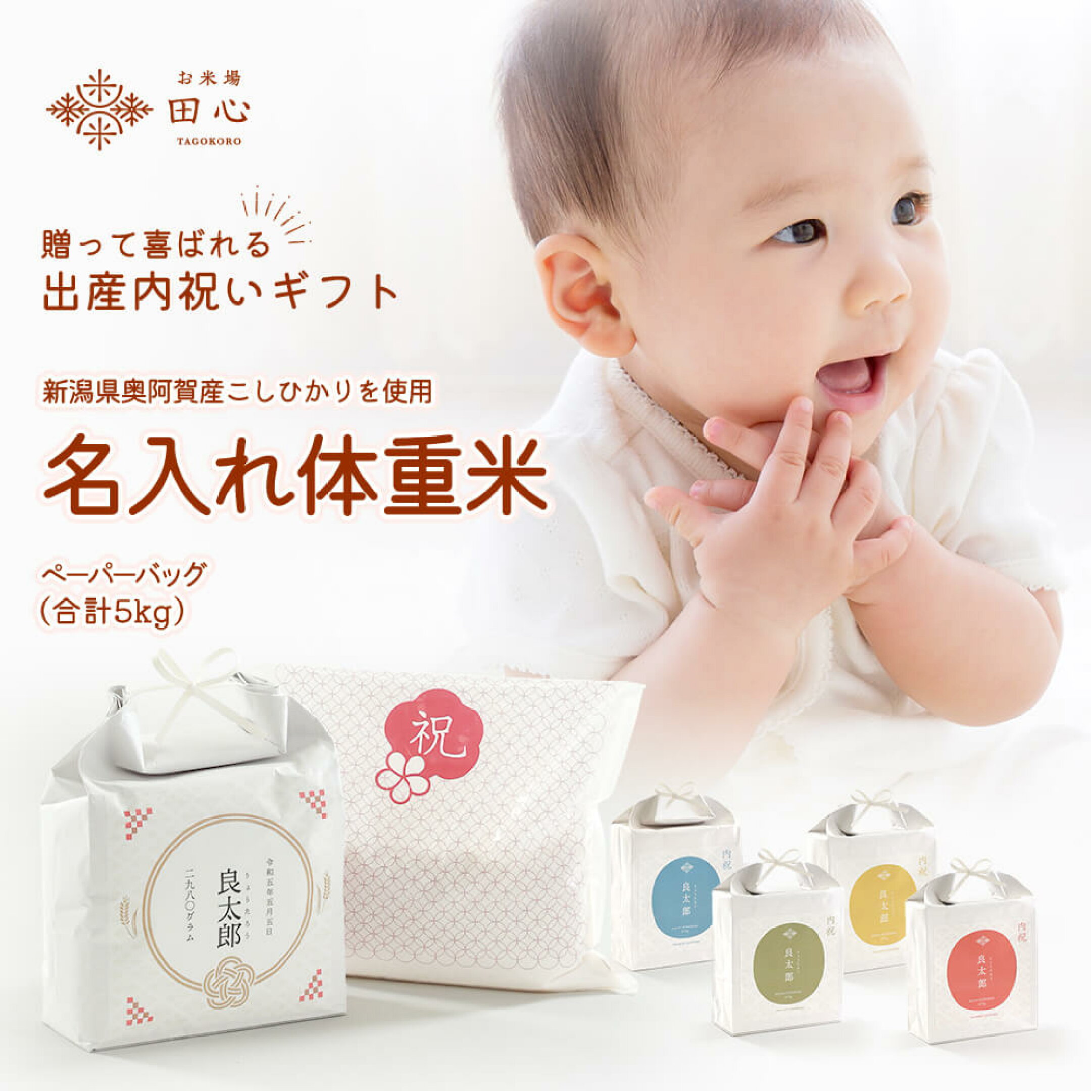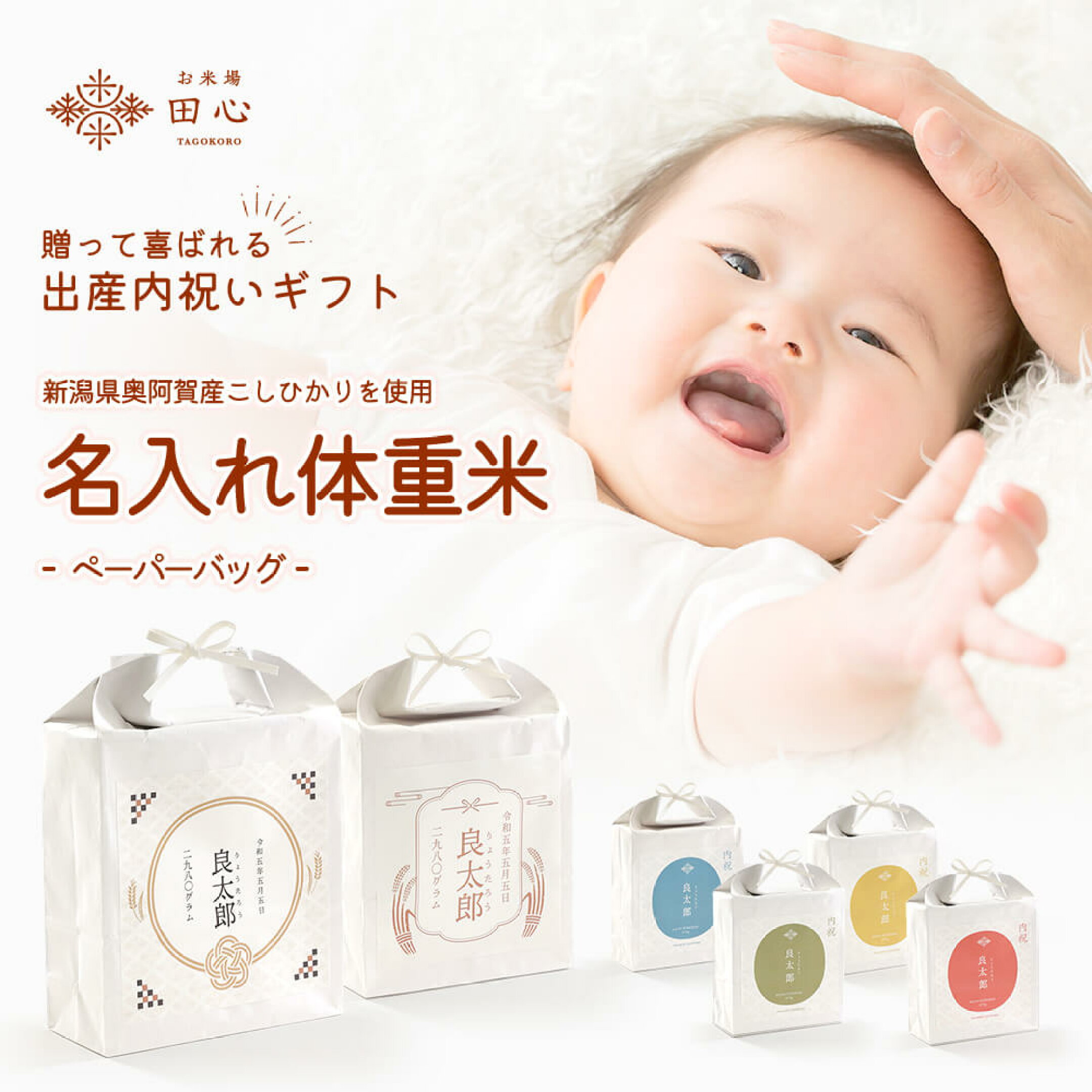 お米場田心の特別なギフト「名入れ体重米」。 赤ちゃんが生まれた時の体重と同じ重さのお米を使用し、その重さを抱きしめることで新しい命の重みを実感していただけます。出産内祝いとしてはもちろん、結婚式での両親へのプレゼントとしても人気が高い商品です。