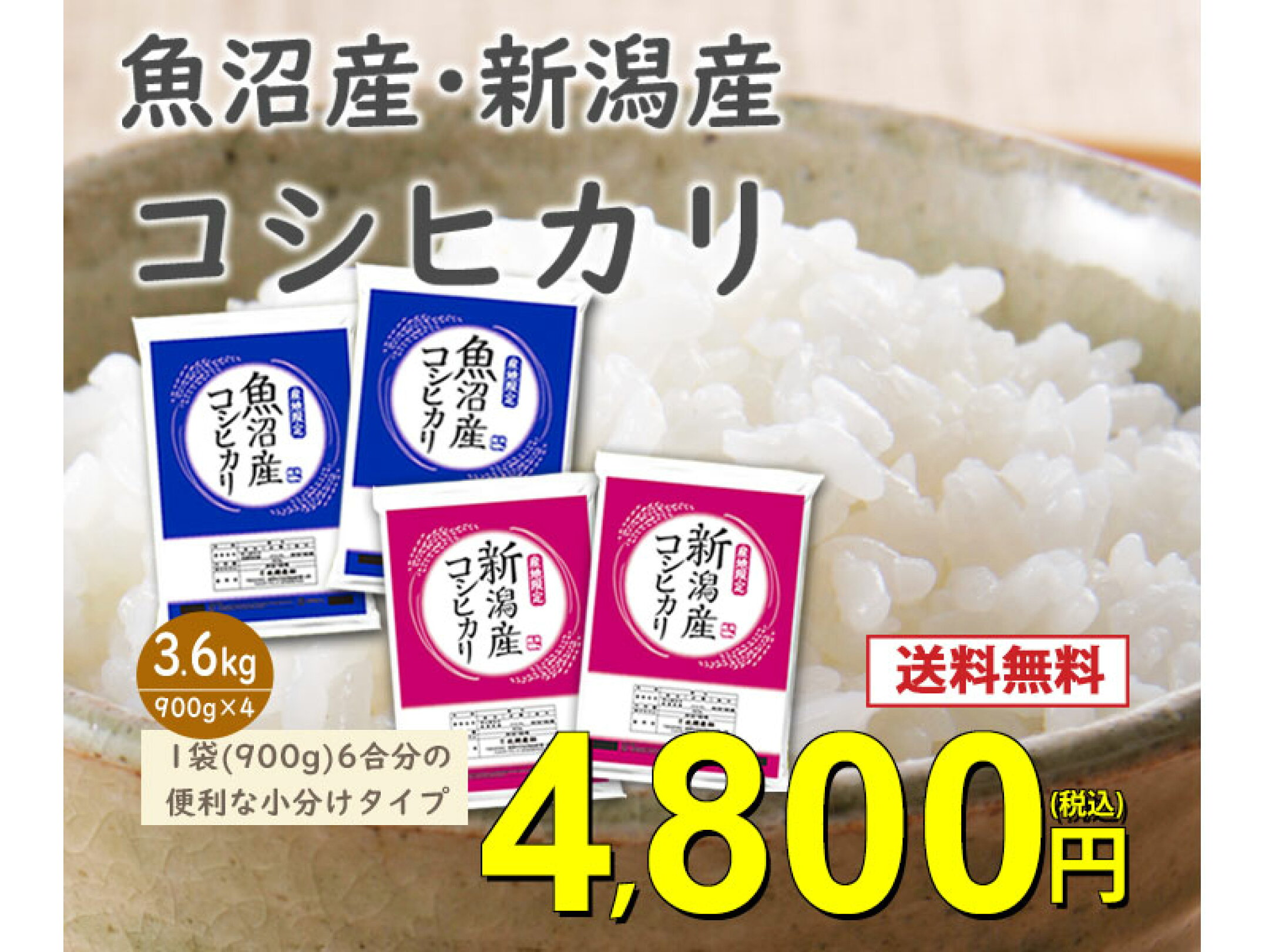 新潟産コシヒカリ 新潟県魚沼産コシヒカリ 3.6kg(各1.8kg) 令和7年産 1袋 6合 900g サイズ 米 こめ 白米 こしひかり 小分け お試し 4袋 送料無料