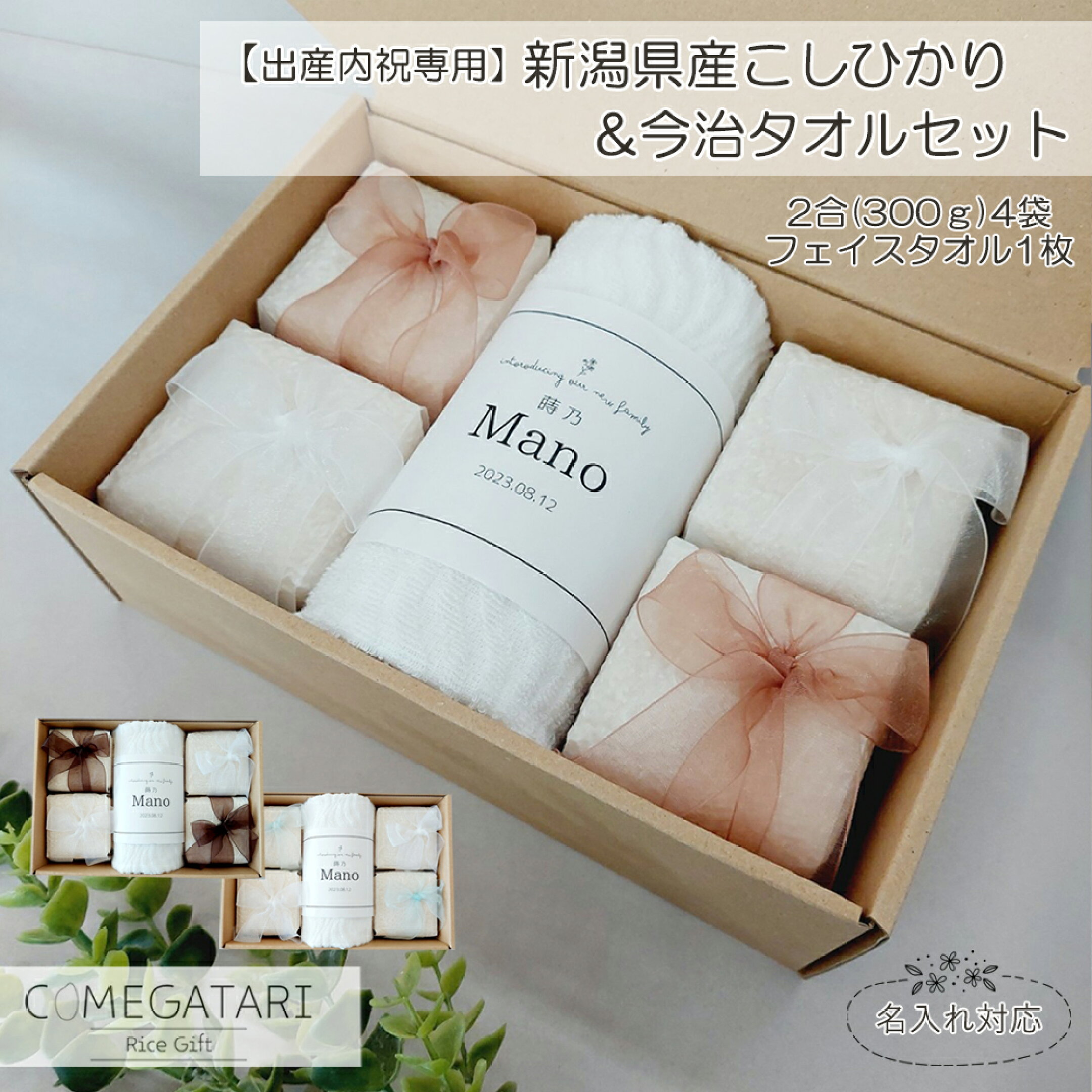 【結婚内祝い専用】結婚内祝い 名入れ お米 新潟県産 コシヒカリ 2合 4袋 今治タオル ギフト フェイスタオル 1枚 白米 こしひかり 結婚祝い お返し 内祝い 名入れ プレゼント リボン 御礼 お礼 おしゃれ 新商品 COMEGATARI コメガタリ