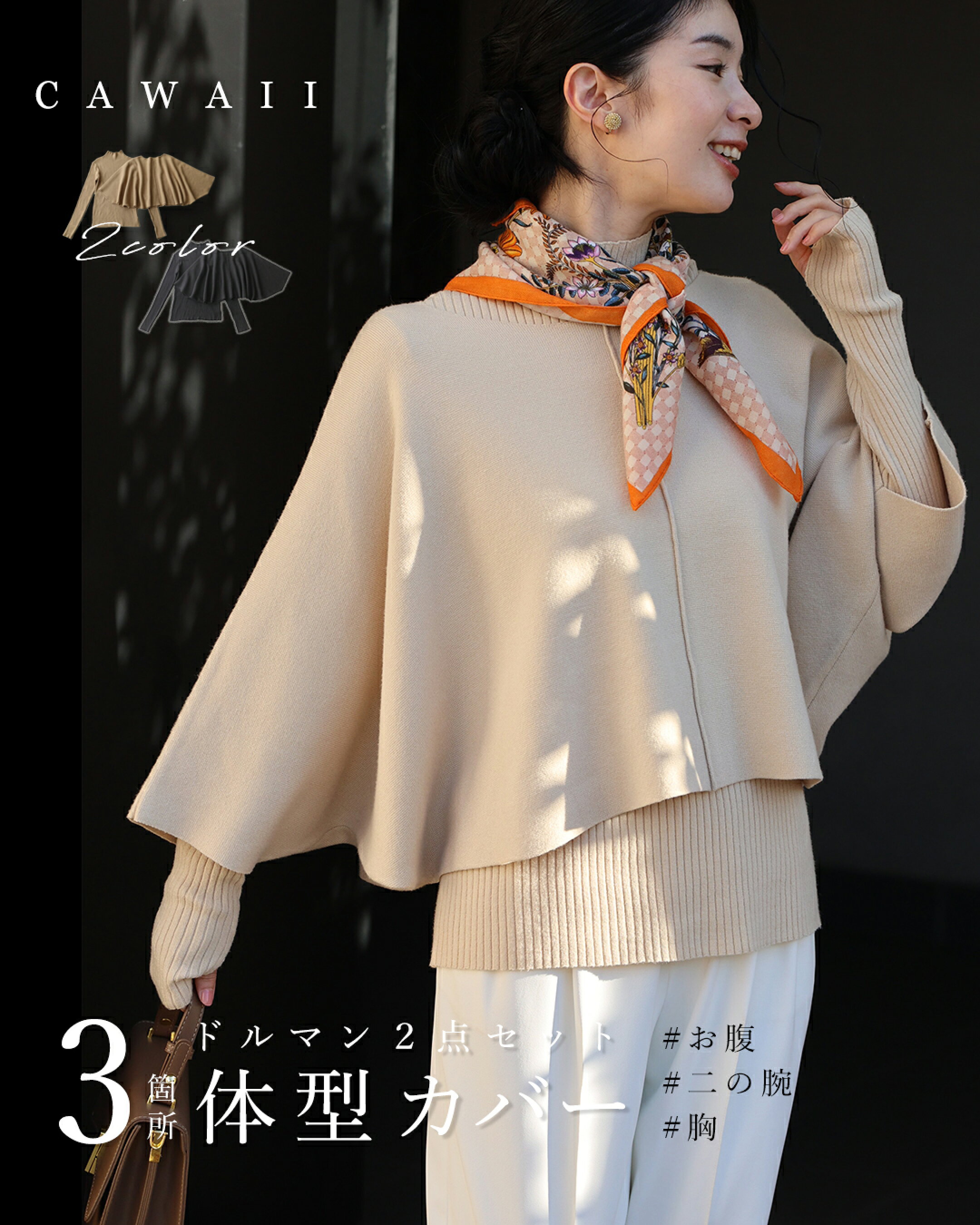 【再入荷♪1/24 20時】(S~3L対応)3箇所 体型カバー ドルマンニット2点セット 【set】/ ケープ/ポンチョ