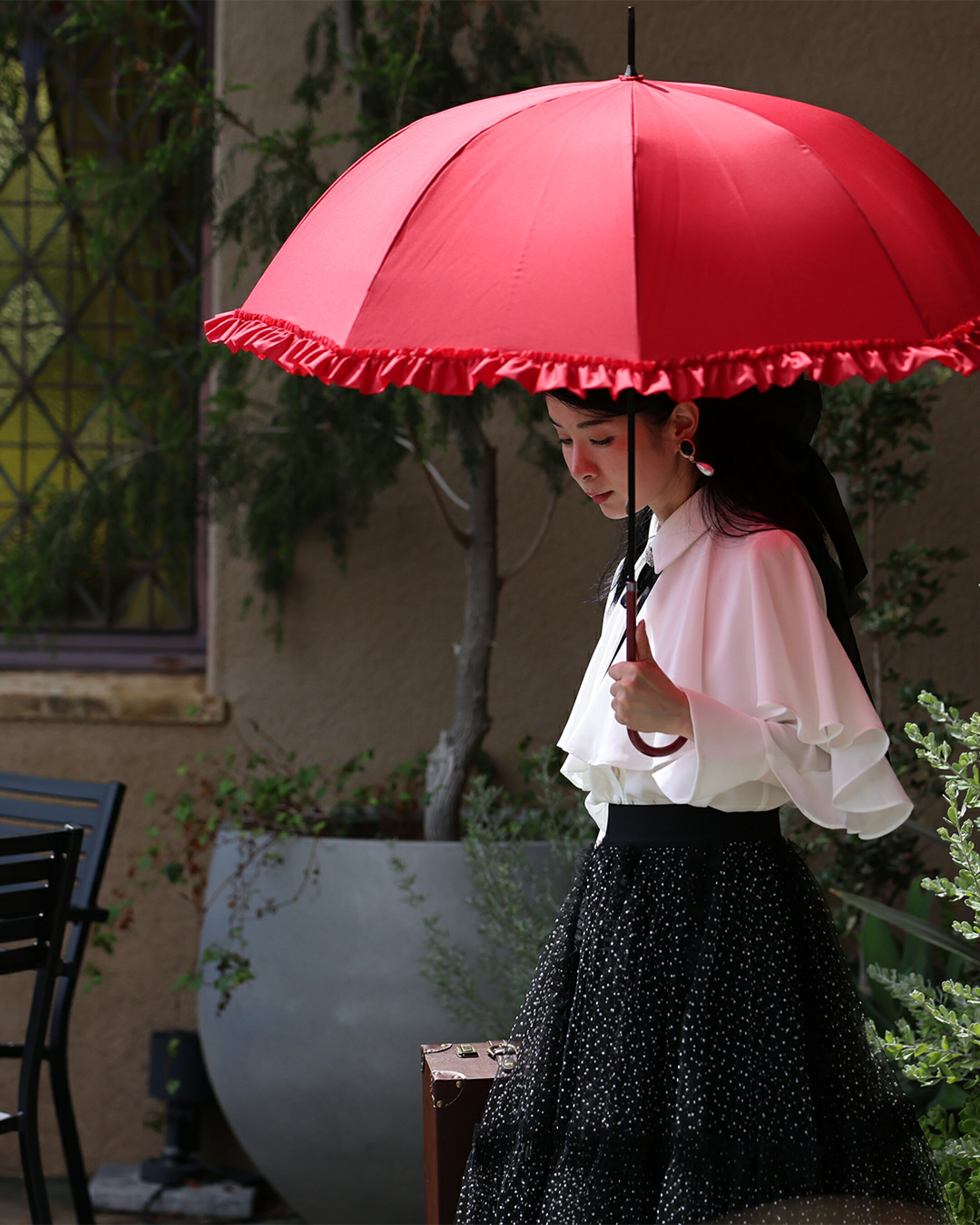 A. モノトーンやレース、花柄と好相性。赤を一点に集めると、装い全体が凛としてまとまります。