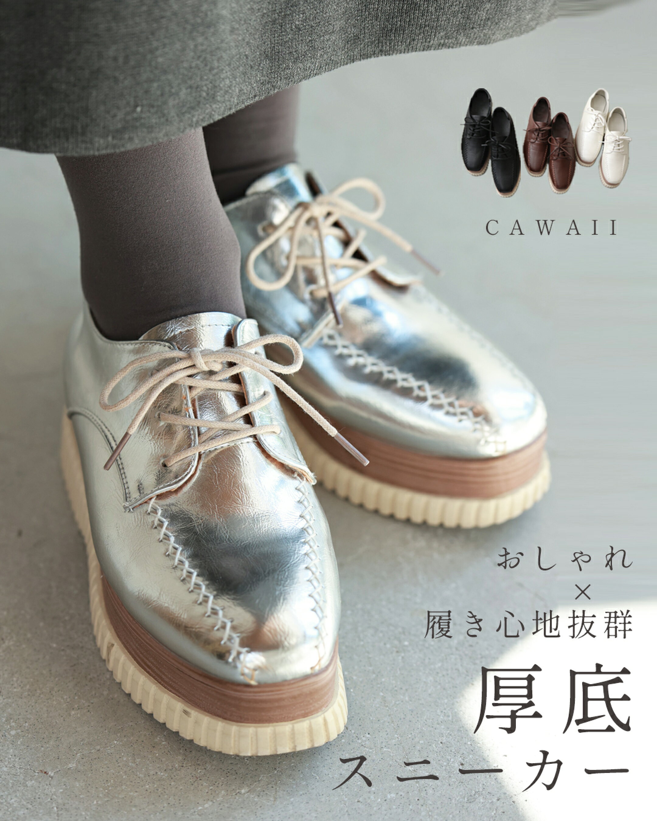 廣瀬:靴自体の横幅がシュっとしてるから、キレイめカジュアルがお好きな方や上品なコーデにも合わせやすいところもポイントですよね。 安田:横から見たときのソール(靴底)の可愛さもいいですよね!木目の入った茶色のところと白のソールが絶妙に素敵。あの部分があることで高級感がでますよね。そして見た目より軽いのも良いんです!同じような厚底靴を持ってるんですけど、それは重すぎてこっちばっかり履いてますもん。 廣瀬:どんな服でも合わせやすいのがいいよね。私あと、すごくカワイくてハマっているのが「靴下合わせ」 福田:靴下合わせ!いつもどんな靴下と合わせてるんですか? 廣瀬:今ブームなのは、「シルバー靴×ターコイズブルー」の合わせ方。すっごく可愛いですよ! 安田:私は「からし色」とか、良く合わせます。 廣瀬:その色合わせもいいよね。小物使いがオシャレだと、この人は上級者だな~って思いますし、靴下ならカンタンでオススメです♪ 小出:たしかに、すぐにチャレンジできそうですね。私も合わせてみよう! 廣瀬:いろんな服に合わせて楽しんでほしいですね。オシャレ迷子さんから上級者さんまで幅広く履けるので。 安田:私たちも愛用しているスニーカー。ぜひ1度履いていただきたいです。 cawaluサロンや試着会、インスタライブでもたくさんご紹介していきますね。 福田&小出:お二人のオススメコーデも、11月以降のメルマガやこちらのページでご紹介予定です。 もしまた新色を製作するとしたら、どんな色が欲しいかもまた教えてくださいね♪廣瀬さん、安田さん今日はありがとうございました。