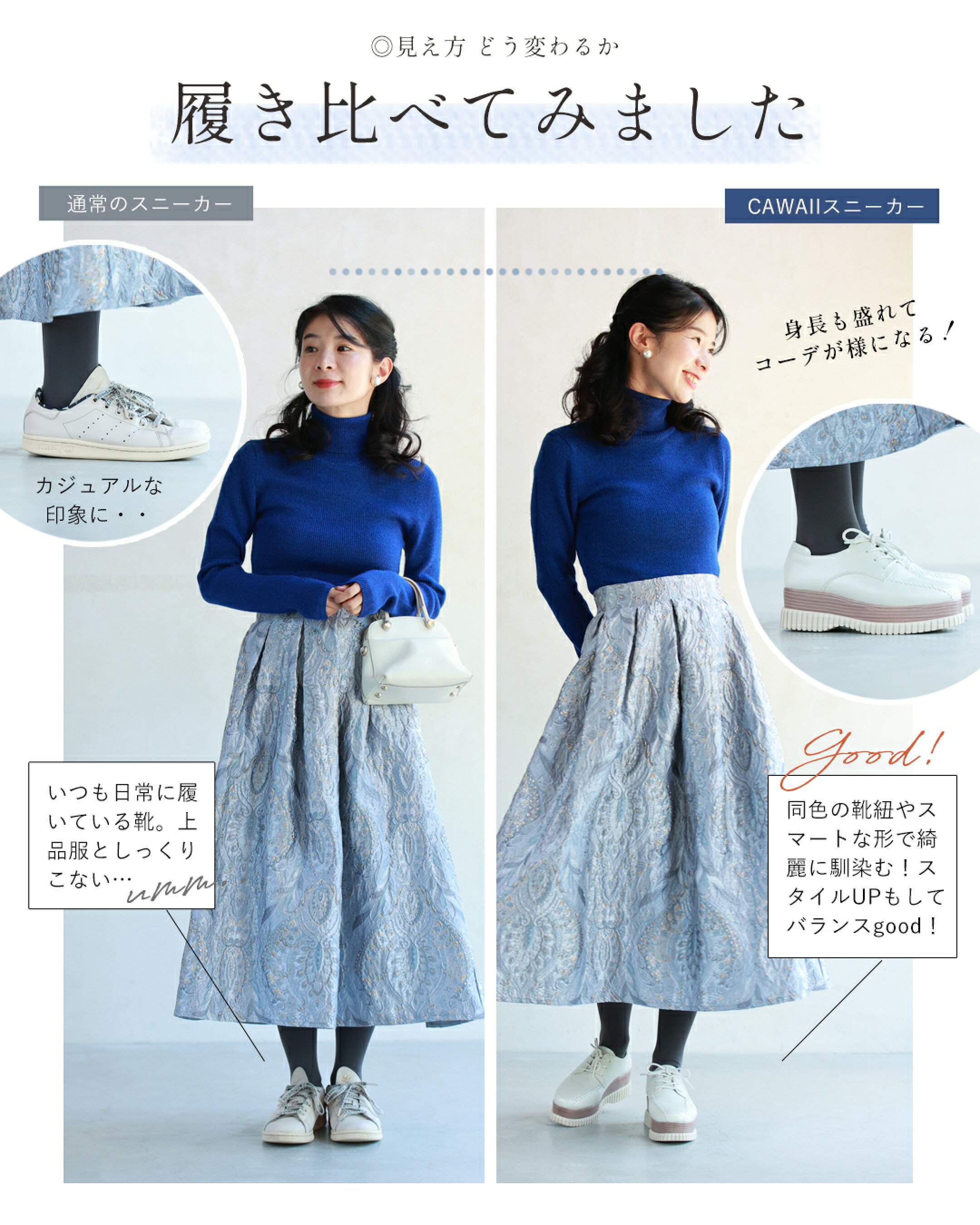 廣瀬:ずっと復活、待ってましたよ~!cawaluのお客様からもよく「いつ入ってくるの?」って聞いていただいてたので。 小出:大変長らくお待たせしました…!満を持して再生産が叶いました。お会いするたびに聞いて下さってましたもんね。廣瀬さんも安田さんもリアルバイしてずっと愛用されているこのスニーカー、どのあたりが【推しポイント】でしょうか? 廣瀬:挙げたらキリがないほどあるんですが、最大に嬉しいポイントは「身長が盛れるソール」 私は身長154cmなんですが、盛れるのが最高!マキシ丈を着てもバランスよく見えて全体がまとまるんですよね。 福田:わかります!私も小柄なので…+5cmのソールなのに自然に盛れて、なおかつオシャレさも履き心地にも両方こだわりたかったんです。