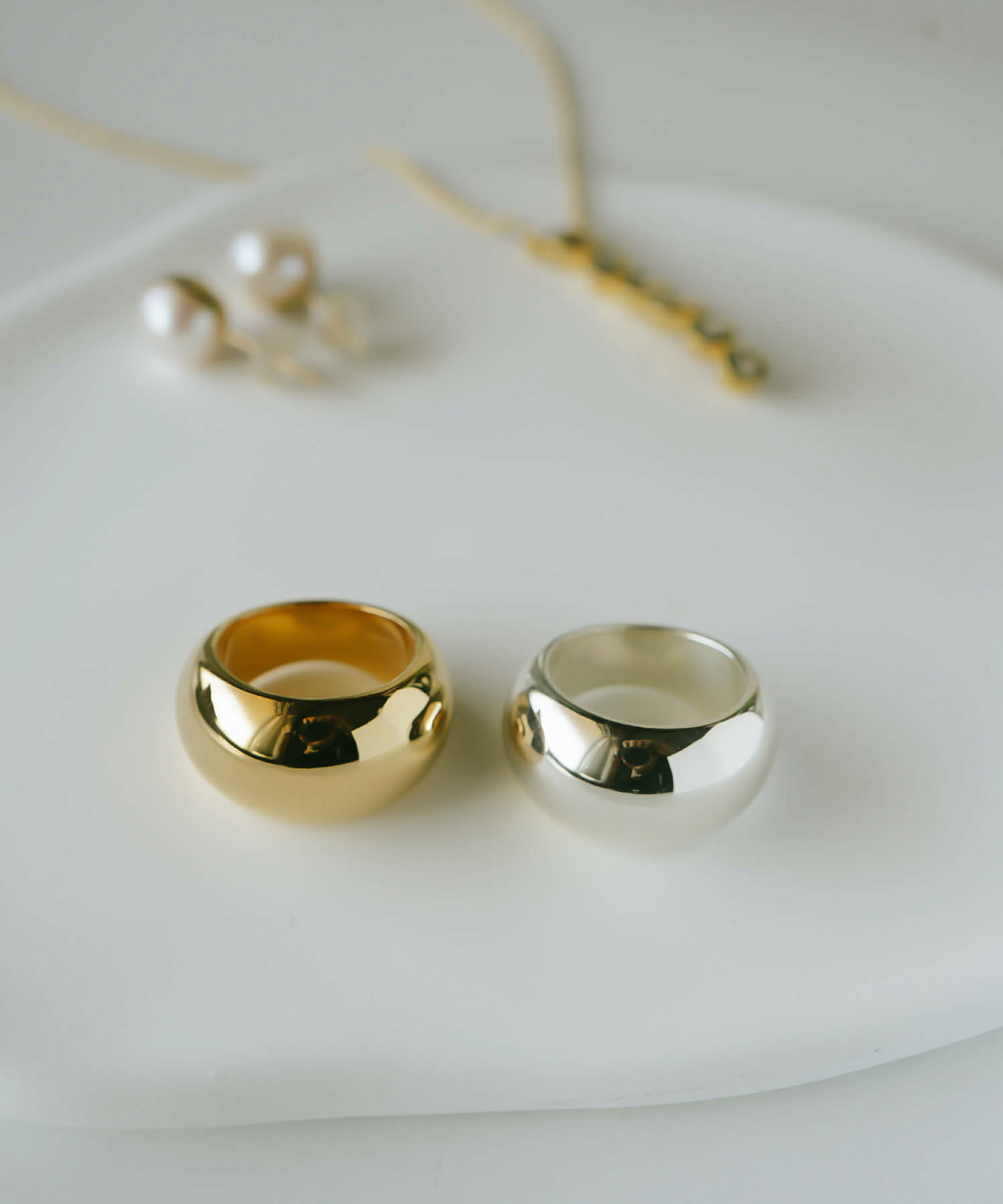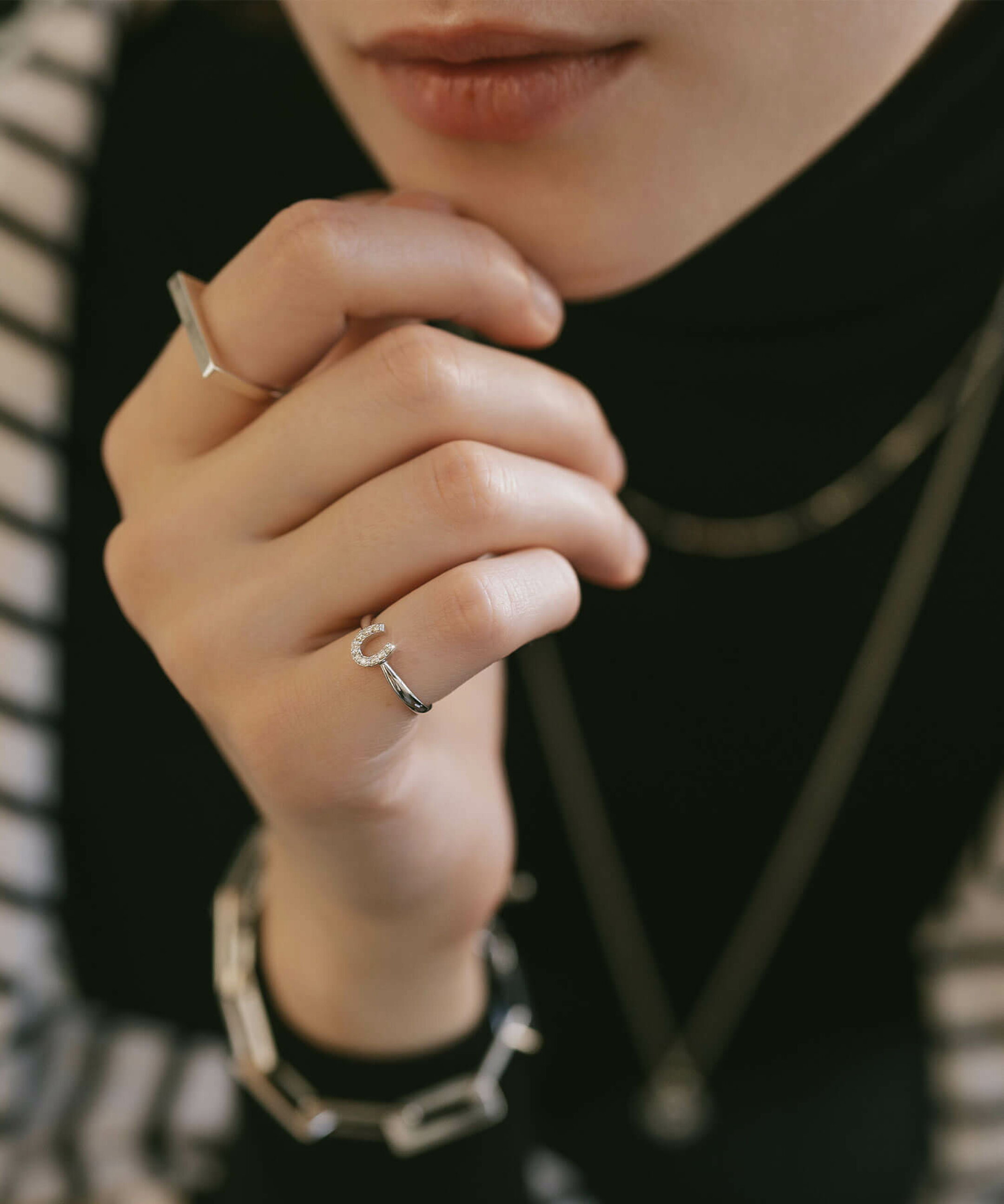 他の指輪と重ね付けすることで、コーディネートの幅を広げることができます。さりげないデザインのピンキーリングなら、シンプルなリングと組み合わせることでモダンなスタイルに。