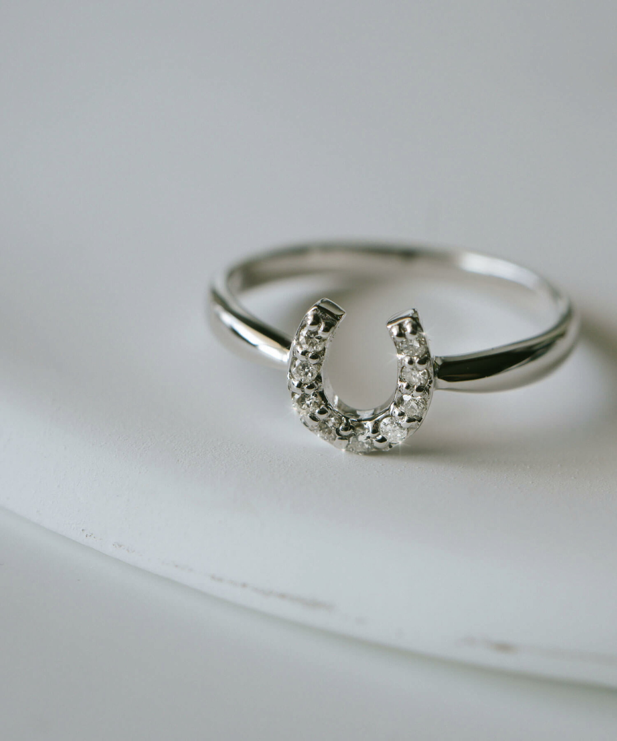幸運の象徴とされるホースシューモチーフ(馬蹄)のK10ホワイトゴールドの華奢なリング。中央に輝く0.06ctのダイヤモンドが、さりげなく存在感をプラスしてくれます。洗練されたミニマル&フェミニンな印象で大人の女性にぴったりなリングです。