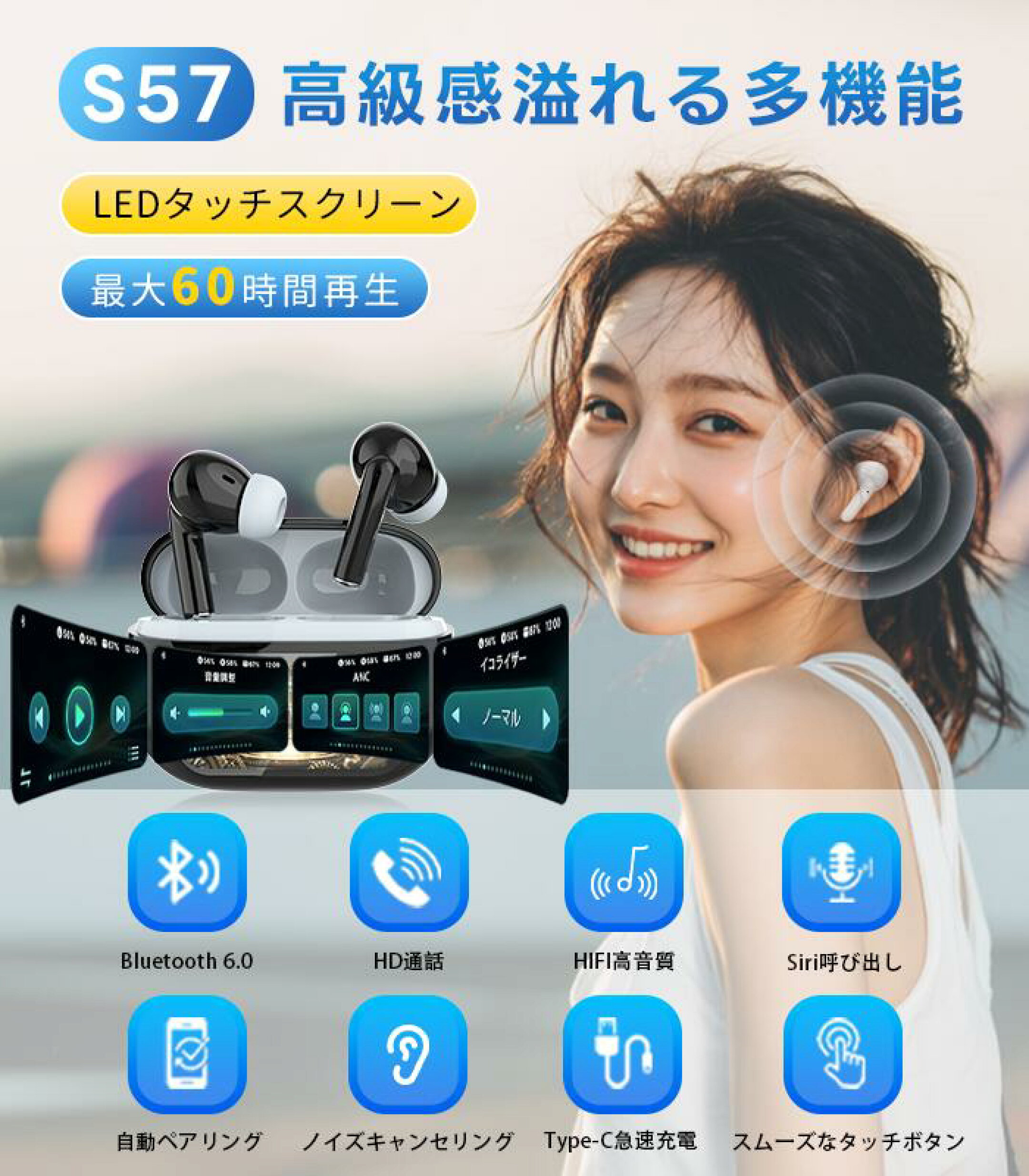 \20%OFFクーポンで1980円/ワイヤレスイヤホン Bluetooth イヤホン ノイズキャンセリング ANC対応 液晶付き 業界TOP bluetooth 6.0搭載 60H連続再生 HiFi高音質 カナル型 LEDディスプレイ 自動ペアリング IPX7防水 日本語説明書 残量表示 Siri対応 タッチ操作