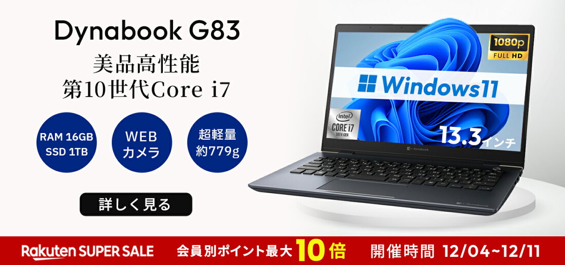 本日10倍!|美品 高性能第10世代Core i7-10610Uノートパソコン 中古 Dynabook G83 超軽量約779g メモリ16GB 新品SSD256GB 13.3インチ フルHD1920*1080 HDMI搭載 WEBカメラ5GWIFI Bluetooth内蔵 中古パソコン MicrosoftOffice2024可 Windows11 送料無料 持ち運び便利