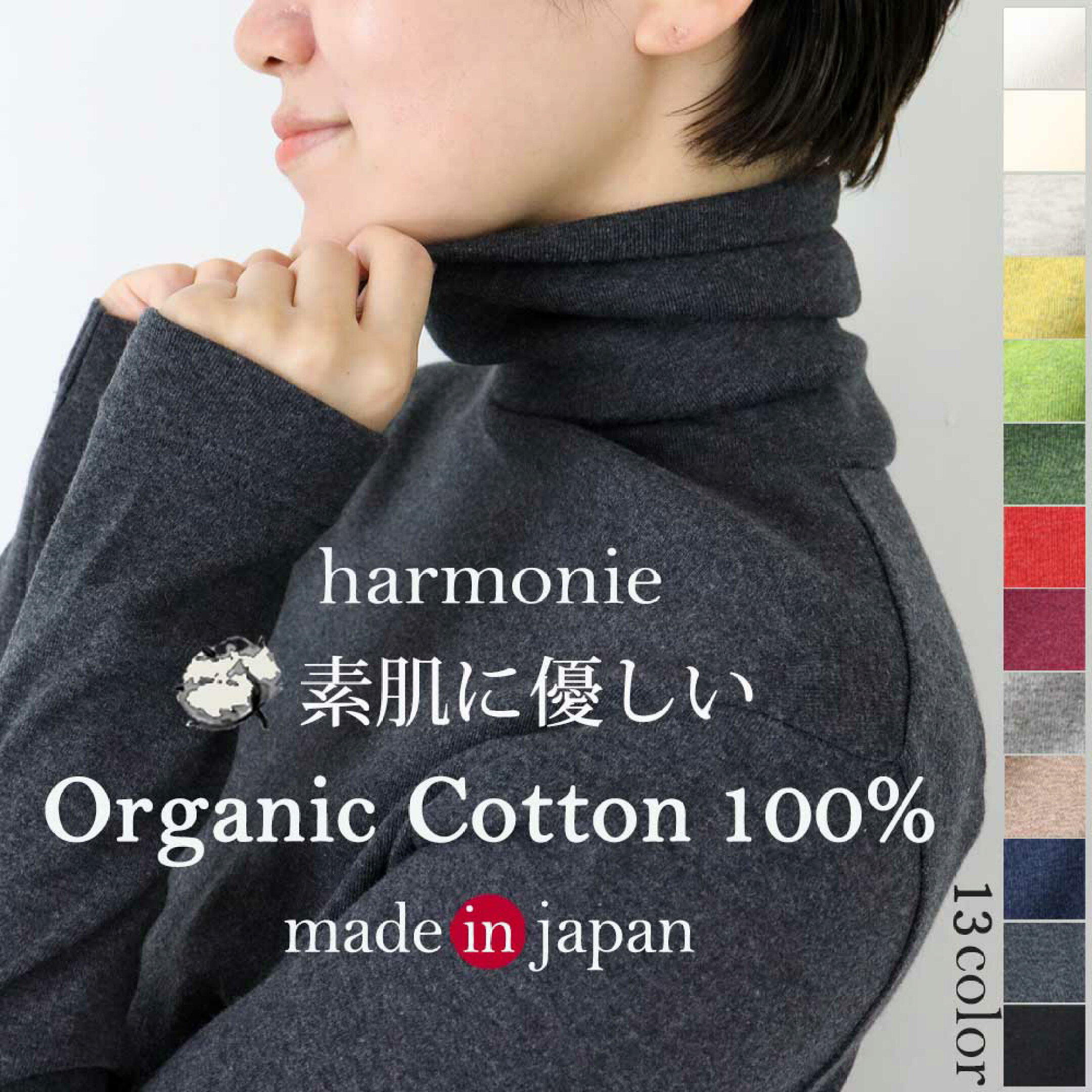 【日本製 harmonie アルモニ】 【予約カラーあり】チクチクしない オーガニックコットン タートルネック 綿100% 長袖 レディース ロンT インナー 秋服 冬 首元 ぴったり ハイネック ストレッチ 丈長め カットソー 白 黒 グレー ネイビー 8510065