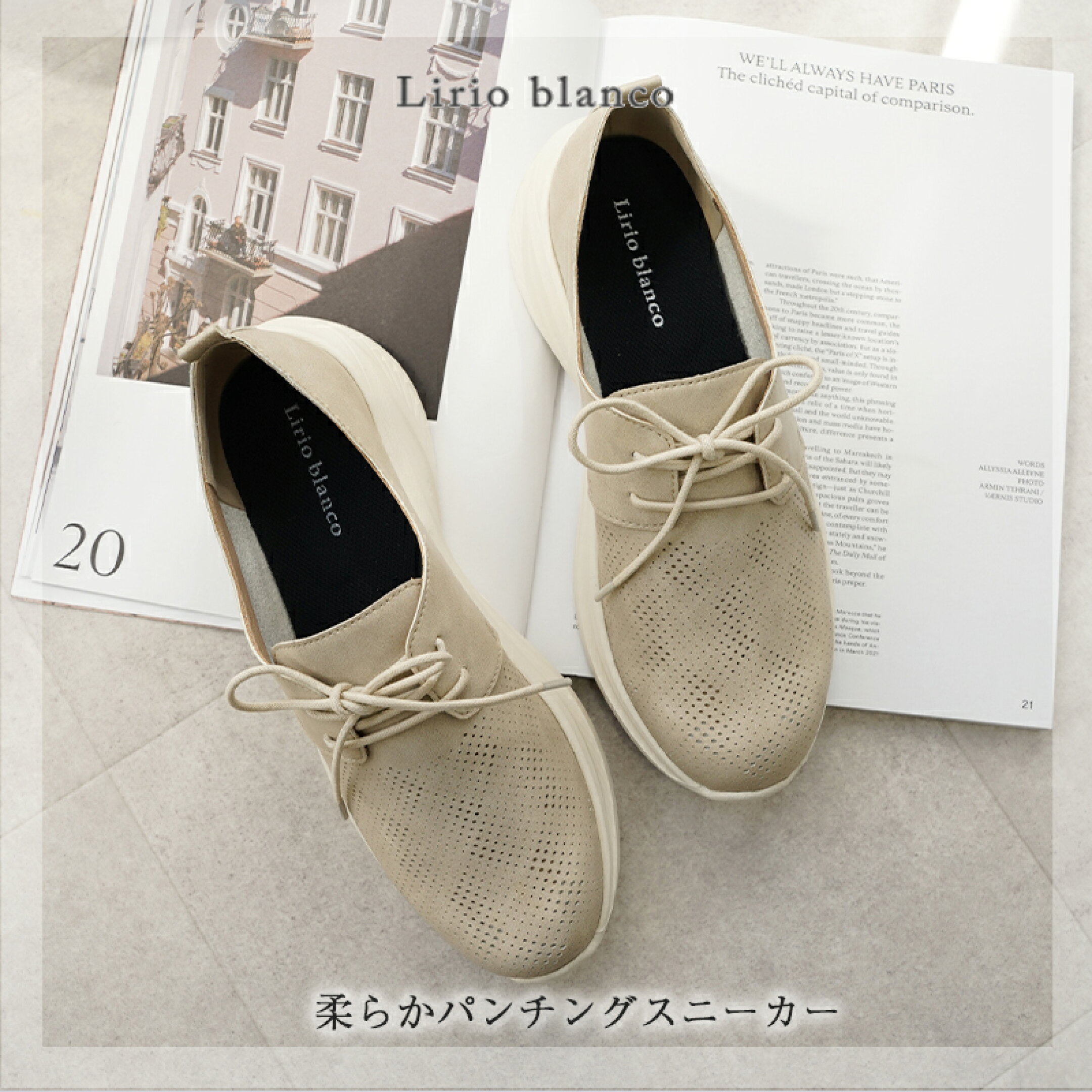 スニーカーレディース 靴紐 ローヒール 柔らかい 軽量 レザー調 人工皮革 パンチング レースアップ 送料無料 ※沖縄除く 黒 ブラック/ベージュ 22.0cm-24.5cm オシャレ 通勤 通学 歩きやすい 甲高幅広 シューズ フラット 3.5cmソール 仕事