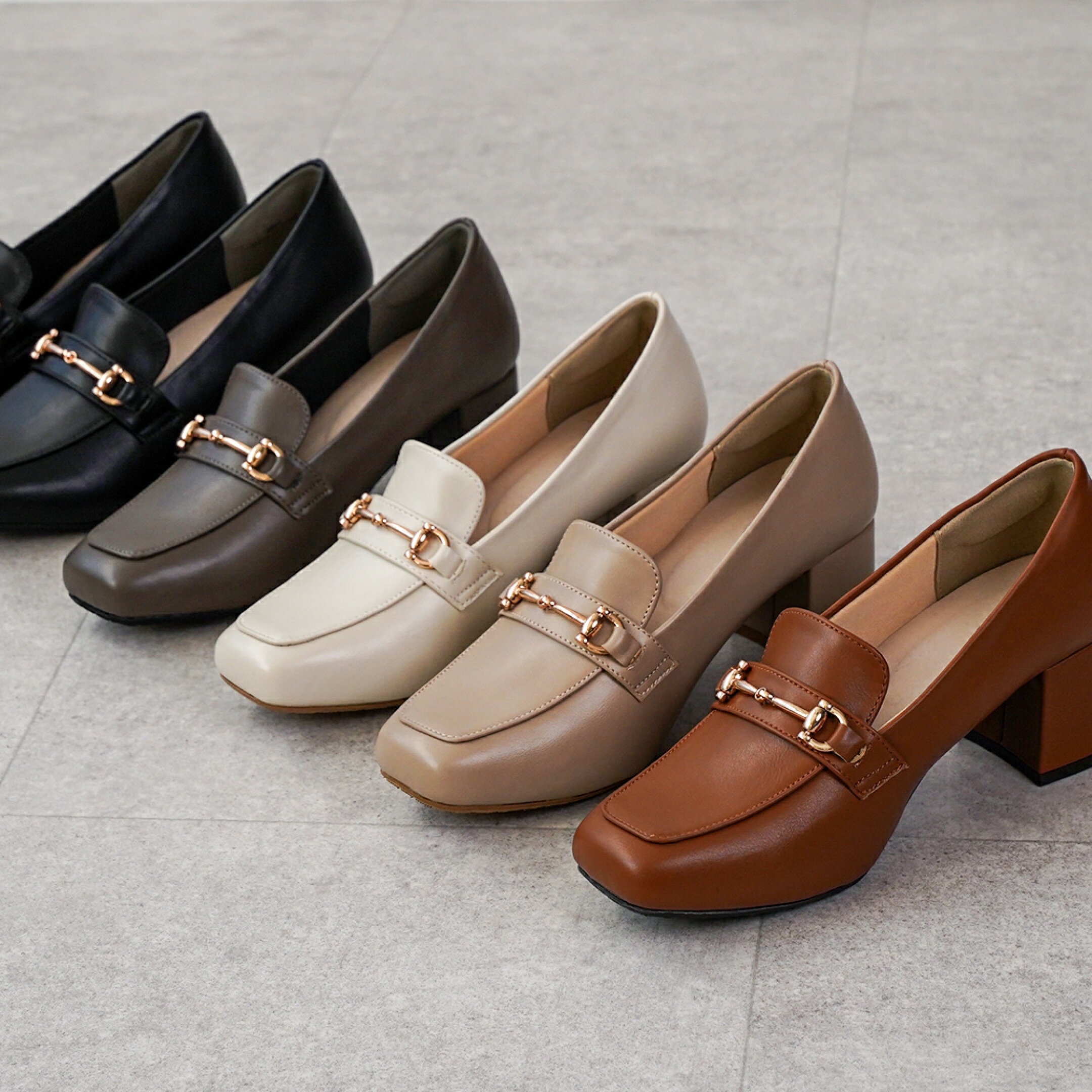 \スタイルアップも叶える/ 5.5cmヒール・スクエアトゥタイプ ・外反母趾気味・甲高幅広さんも痛くなりにくい! ゆったり4Eワイズ ・トップリフトの改良を重ね、カツカツ音を低減した静音ヒールを採用 ・接地面から2.5cmまでの防水仕様 ・長時間歩いても疲れにくい! 片足約275gの軽量仕様&足にかかる負荷を分散させる 3Dアーチ構造のふかふかインソール ・気品のあるゴールドビットがオシャレ度を上げるワンポイント ・PUレザー素材は水や汚れに強くお手入れもラクチン