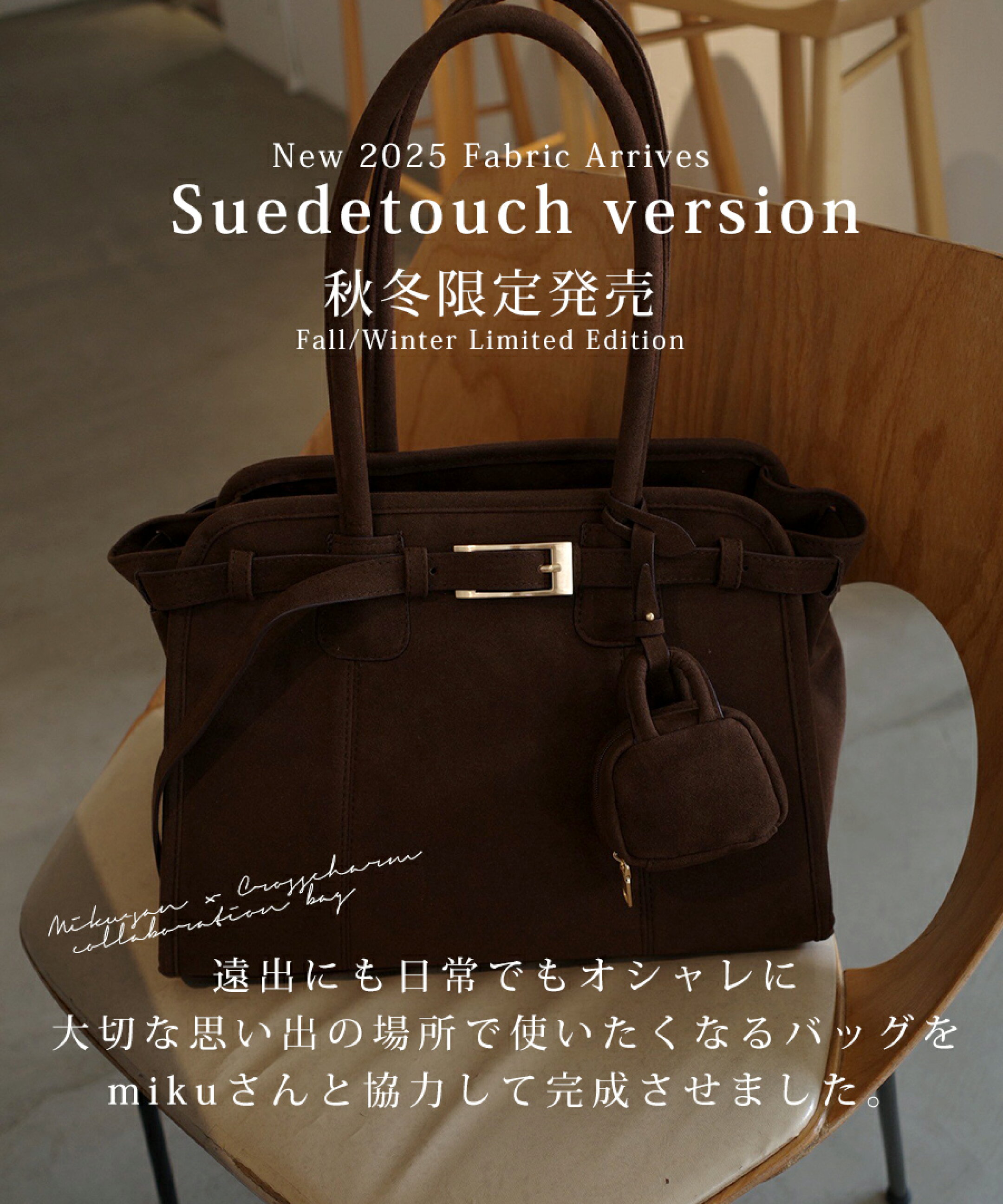 ファッションインフルエンサーとして活躍するmikuさんとcrosscharmの待望のコラボバッグに、秋冬だけのスエードバージョンが登場。上質な素材感と季節のムードをまとった限定バッグで、洗練されたスタイルを演出します。 この秋冬だけの特別な一品。限定コラボバッグにスエード素材をまとわせ、季節感あふれるラグジュアリーな表情へ。数量限定での発売です。