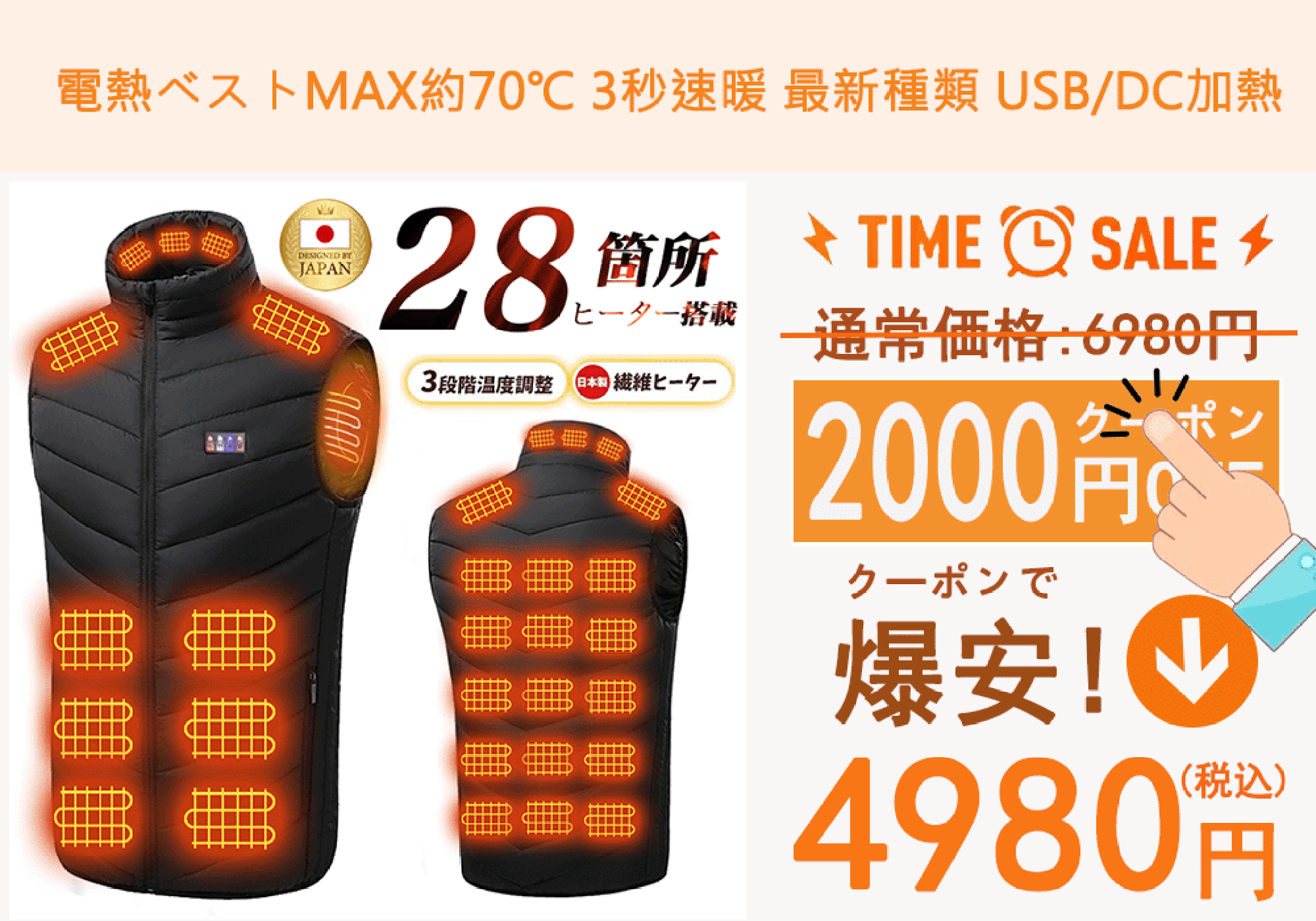 《SS限定☆クーポンで3,980円~》電熱ベスト【日本製28枚繊維ヒーター 30000mAhバッテリー】 MAX約70℃ 3秒速暖 最新種類 USB/DC加熱 発熱ベスト 防寒ベスト ヒーター 付き 加熱ベスト usb 電気ベスト レディース メンズ 速暖 防寒 電熱ウェア 大きいサイズ 男女兼用