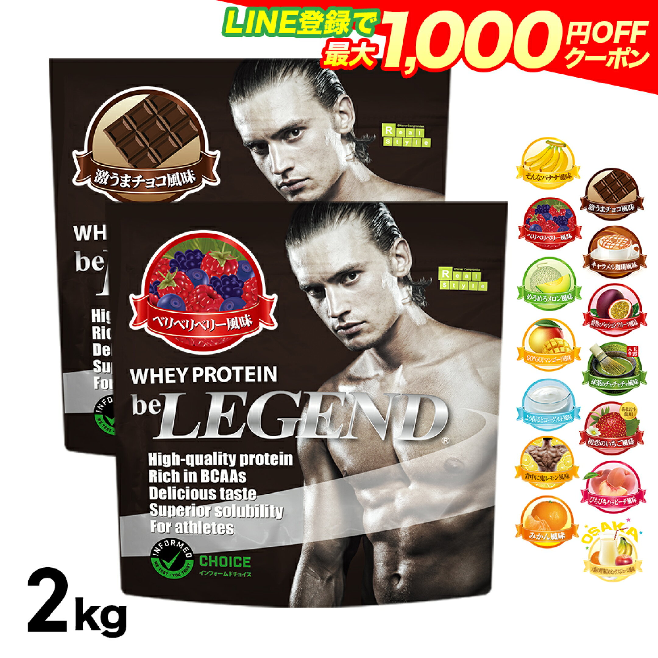 【LINE登録で最大1000円OFF】プロテイン ビーレジェンド ホエイプロテイン 女性 男性 WPC チョコ ベリー バナナ メロン 抹茶 鬼レモン ピーチ ヨーグルト マンゴー ミックスジュース 選べる2種セット1kg ×2袋 (2kg) ゲリラ