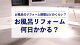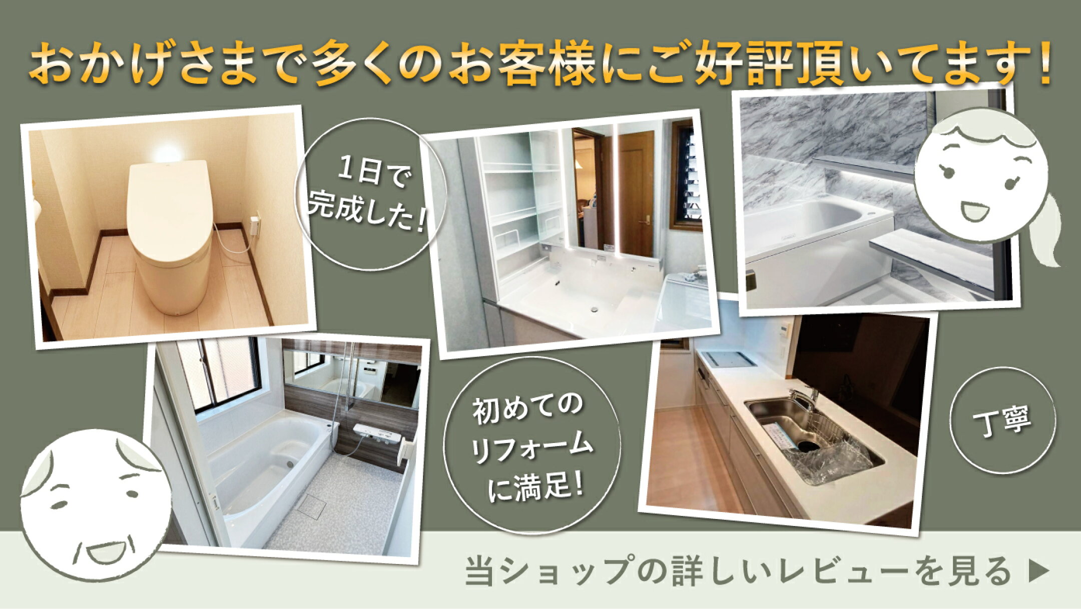 施工サービス60万件以上。 システムバス・キッチン住設メーカー公認のリフォーム会社によるオンラインショップです。 お風呂・キッチン・トイレ・洗面台のリフォームならお任せください。 豊富な経験と実績を活かし、安心で高品質なリフォームをご提供します。