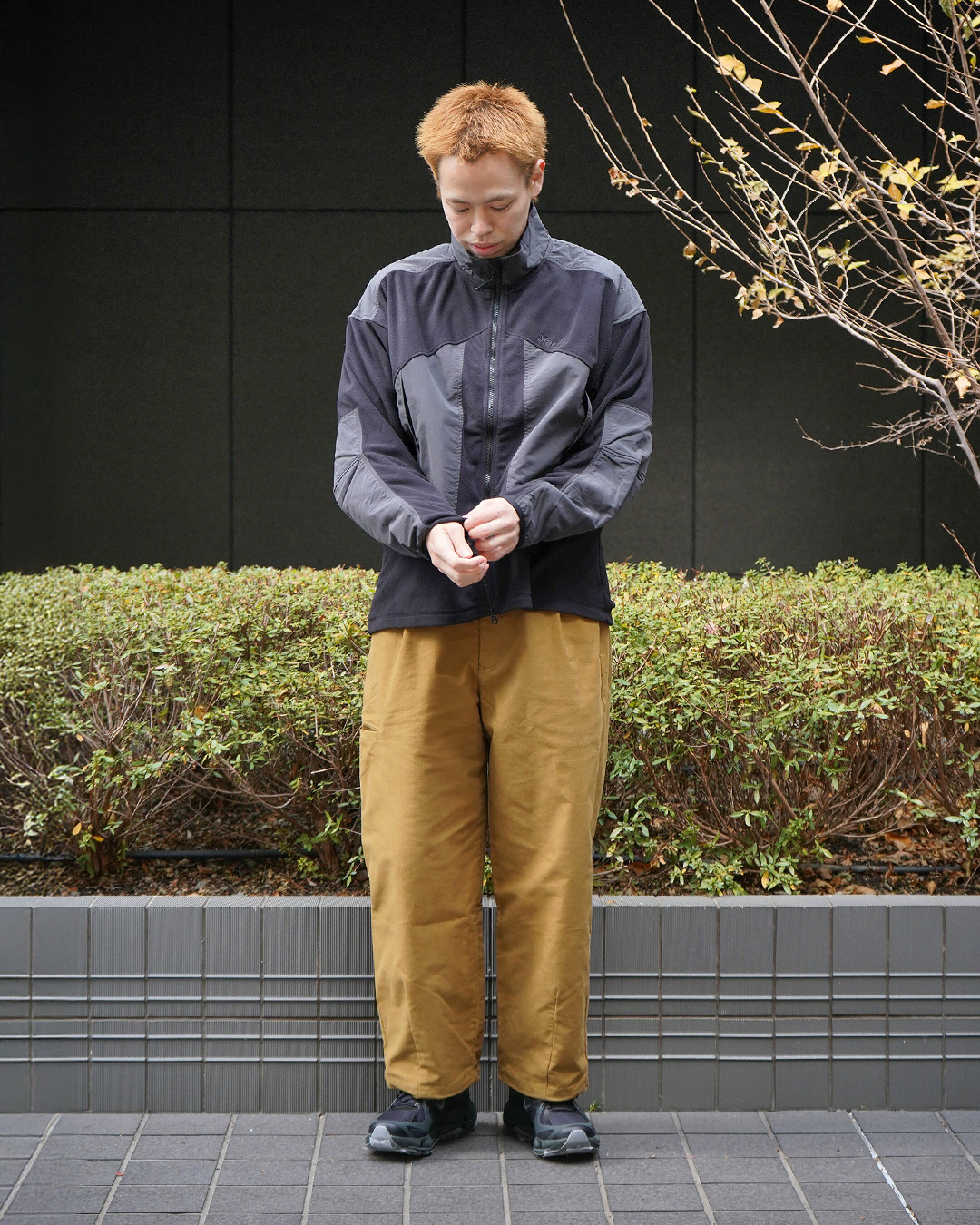 ❚ スタイリングのポイント トップスは、印象的なカラーリングと切り替えデザインがコーディネートの主役になりつつ、フリースならではの軽さと柔らかさで、全体をリラックスした雰囲気にまとめてくれます。そこに、スエード調の起毛感を持つモールスキンパンツを合わせることで、見た目にも着心地にも暖かみをプラスしています。 イージーパンツはストレッチ性があり、裾ゴム仕様のため、スニーカーから革靴まで幅広いシューズと好相性です。 今回はmarmotに寄せて、MERRELのSPEED ARK MATISを合わせてみました。存在感のあるシューズなのですが、モールスキンのパンツでも絶妙な抜け感をプラスしてくれます。 アウトドア由来の機能性と、日常着としての落ち着きを両立した、タウンユースからちょっとした外出まで活躍するスタイリングとなっています。 ◆着用サイズ (174cm/56㎏) OUTER:M PANTS:2 SHOES:26.5