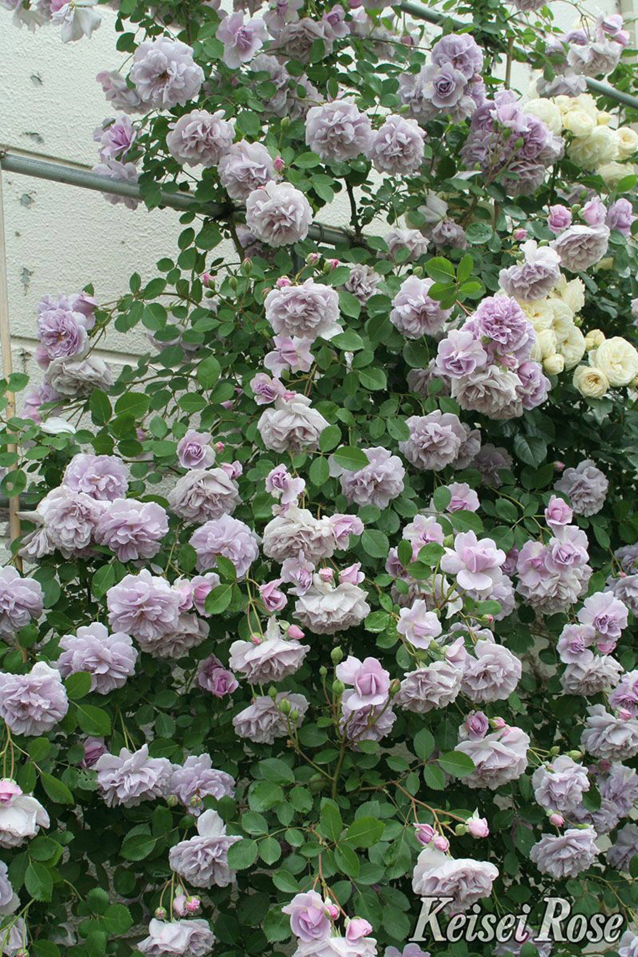 ズバリ花色でしょう。藤色は日本人に特に好まれる傾向がありますが、そのほとんどは木立性であり、つる性かつ藤色は多くありません。中大輪系だと、他にはつるブルームーンぐらいでしょうか。 花付きの良さも見過ごせません。四季咲き性が強く、中でも春の一番花は素晴らしく、一面が涼しげな藤色に染まります。実際に花を見てその良さに感動し購入に至る事が多い品種でもあります。 多くのガーデンに採用されていますが、販売元の京成バラ園メインガーデンの壁面は圧巻ですし、寒冷地の軽井沢レイクガーデンのオベリスク仕立ても見事でした。 クウォーター気味のロゼットの花形や可愛らしい丸葉、耐病性、樹勢の強さも魅力でしょう。