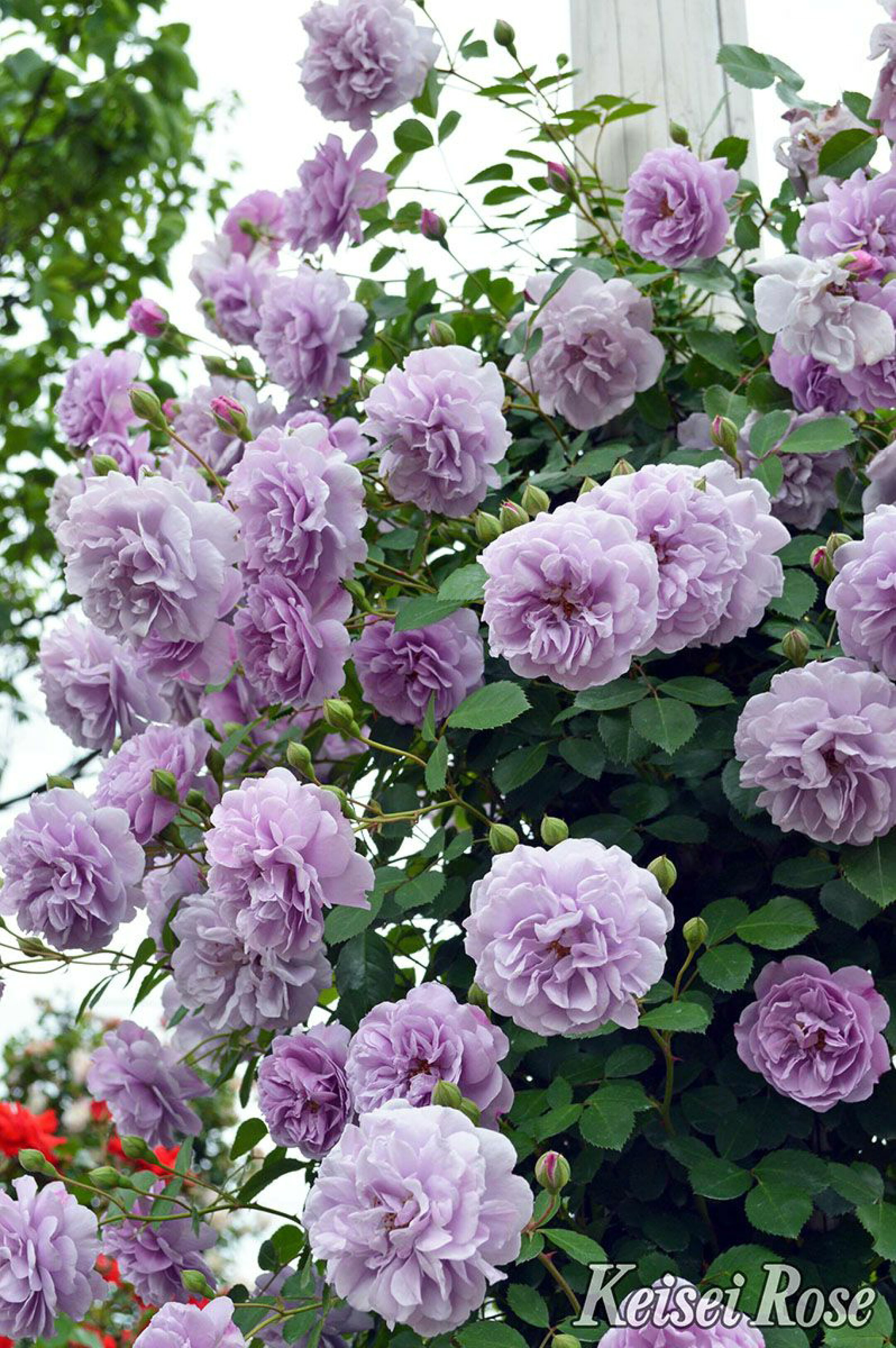 ドイツのタンタウ社作出の藤色のつるバラです。 発表以来、常に注目を集めてきましたが、ここ数年はSNSなどでの注目から火が付き、爆発的に支持を集めています。 つるバラの中では永遠の定番ピエールドゥロンサールに続く位置付けまで上がってきており、同じく定番であるデルバール社のナエマやイングリッシュローズのグラハムトーマスを凌ぐ人気を見せています。