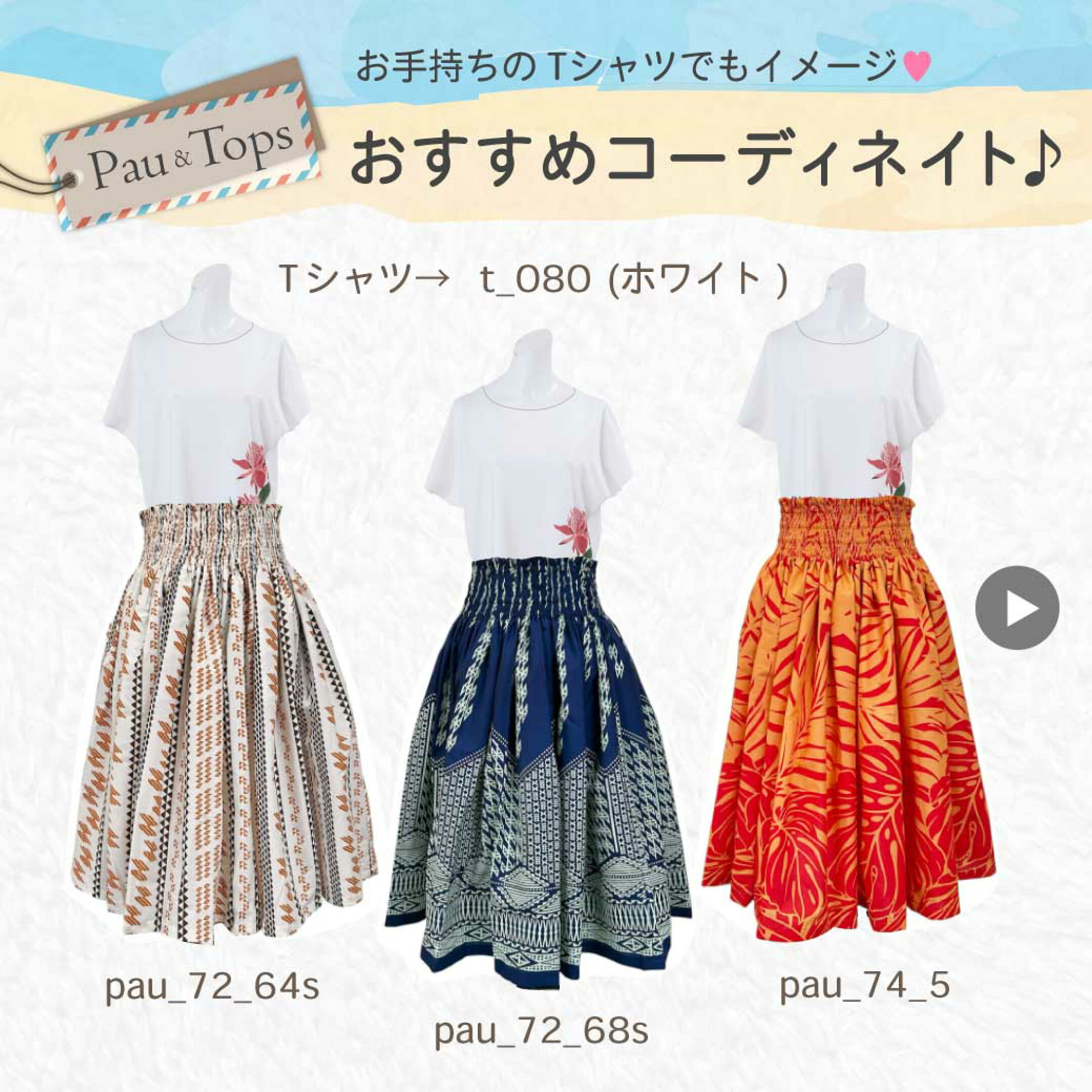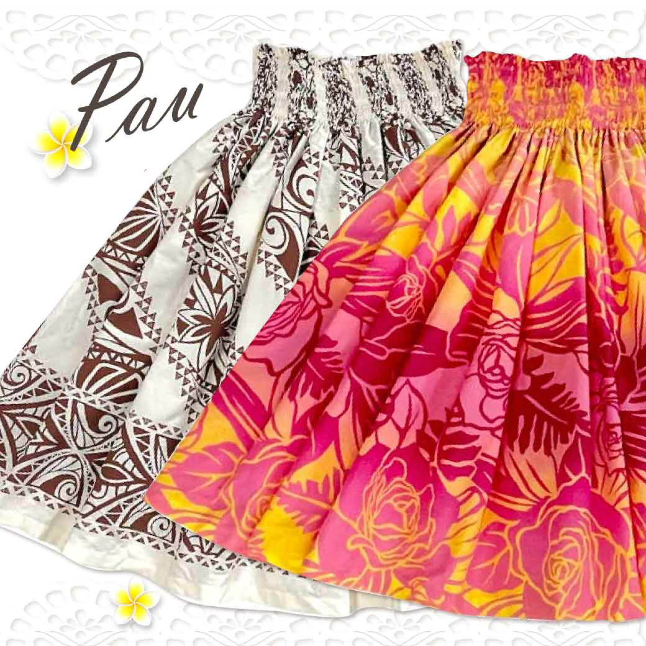 4メートルのハワイ生地を使ったボリュームたっぷりのパウスカート。一度履いたらやめられない履き心地の良さが魅力です。