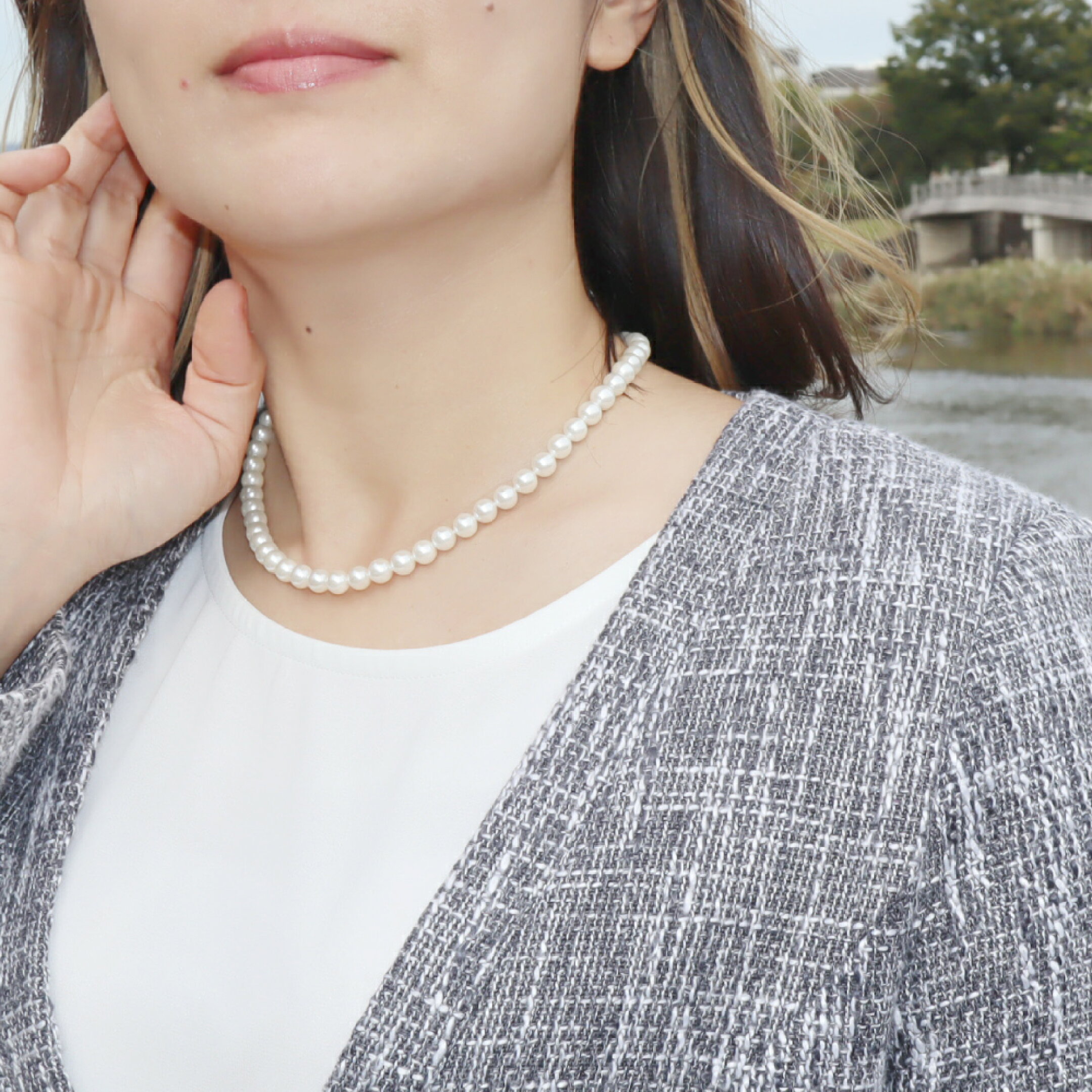 ✅6ミリは控えめな上品さ ✅7ミリは汎用性の高さ ✅8ミリは存在感と使いやすさのバランス ✅10ミリは格調高い華やかさ を演出します。 卒業・入学式に最適な8mm42cmパールネックレスは、上品さと華やかさを兼ね備えた定番アイテムです。 貝パール(真珠)の美しい光沢が、セミフォーマルな装いに品格を添えます。 42cmの長さは、襟元をすっきりと見せ、どんなドレスやスーツにもマッチします。 8mmの大きさは、7〜8mmの定番サイズ内で、存在感がありながら派手すぎない絶妙なバランス。 一連タイプで、お祝いの席にふさわしい重厚感を演出。 フォーマルシーンだけでなく、結婚式や謝恩会など様々な場面で活躍します。 子どもの晴れ舞台を見守る母親の装いとして、写真映えも抜群。 コサージュとの相性も良く、思い出に残るセレモニーを演出します。 TPOを押さえつつ、お祝いの気持ちを表現できる理想的なアクセサリーです。