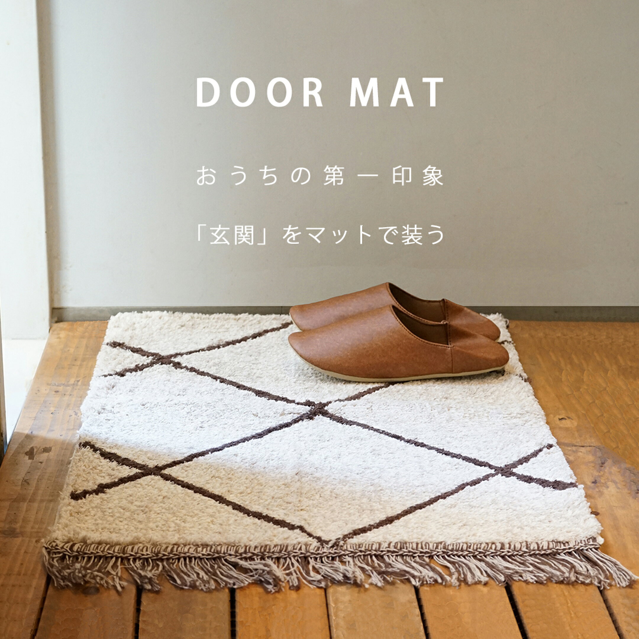 玄関マット calmland 綿100% 天然素材 洗える ベージュ アイボリー 室内 フリンジ モロッコ モロッカン 北欧 日本製 おしゃれ 滑り止め かわいい ラグ マット 引越 新築 ギフト インテリア 模様替え 50×82cm【calmland(カームランド)】ベニワレンフロアラグ70