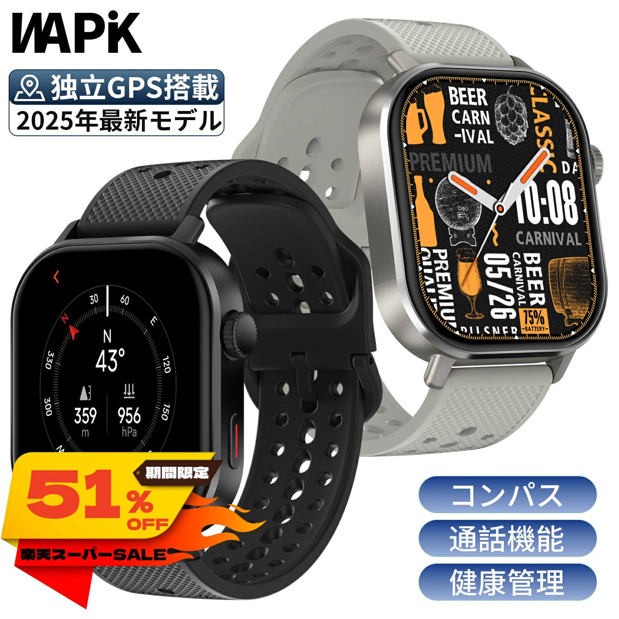 「スーパーSALE 51%OFF&半額クーポンで7,699円」スマートウォッチ Wapik ST60 独立 GPS機能 搭載 2.13インチ スマホ不要 モーションパス記録 通話機能 常時表示 メッセージ通知 健康管理 血中酸素 心拍数 防水 急速充電 腕時計 運動モード アンドロイド対応 iPhone対応