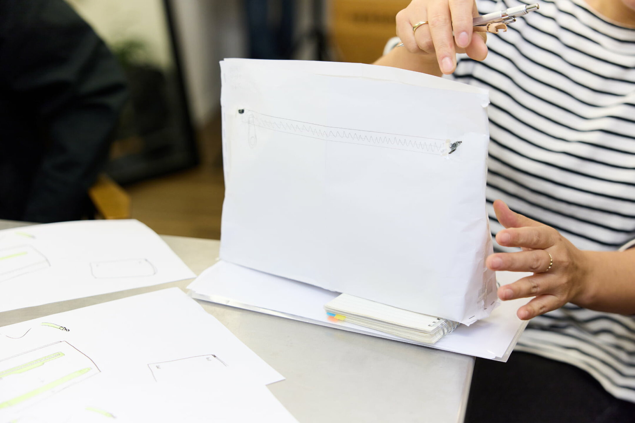 サンプルをもとに、女性スタッフがクラッチ持ちをしたときのホールド感や、革の柔らかさを確認している様子。 男女年齢を問わず持ちやすく、パートナーとシェアして持つことも可能。 エルゴポックの魅力の1つでもある“ニュートラルさ”は、この当店限定モデルでもやはり健在です。