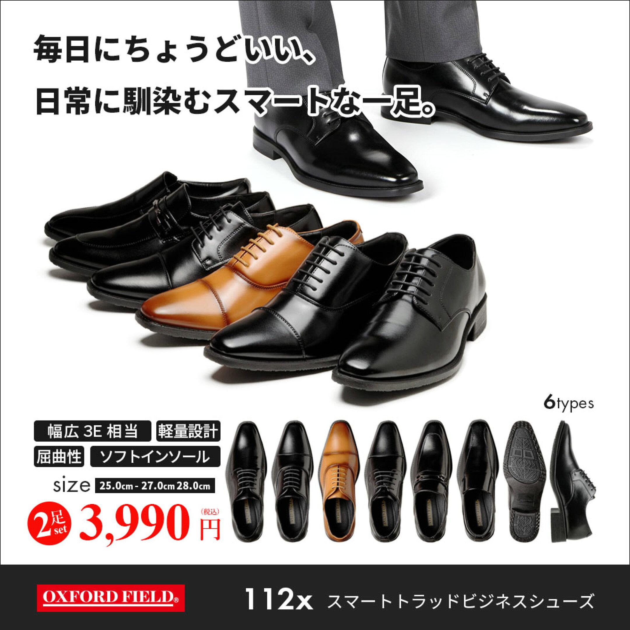 ビジネスシューズ 2足セット メンズ 歩きやすい 走れる 疲れにくい 軽量 防滑 3E 紳士靴 革靴 ブラック 黒 全10種 25cm 〜 28cm OXFORD FIELD 1130 1131 1132 1133 1140 1141 1142 1143