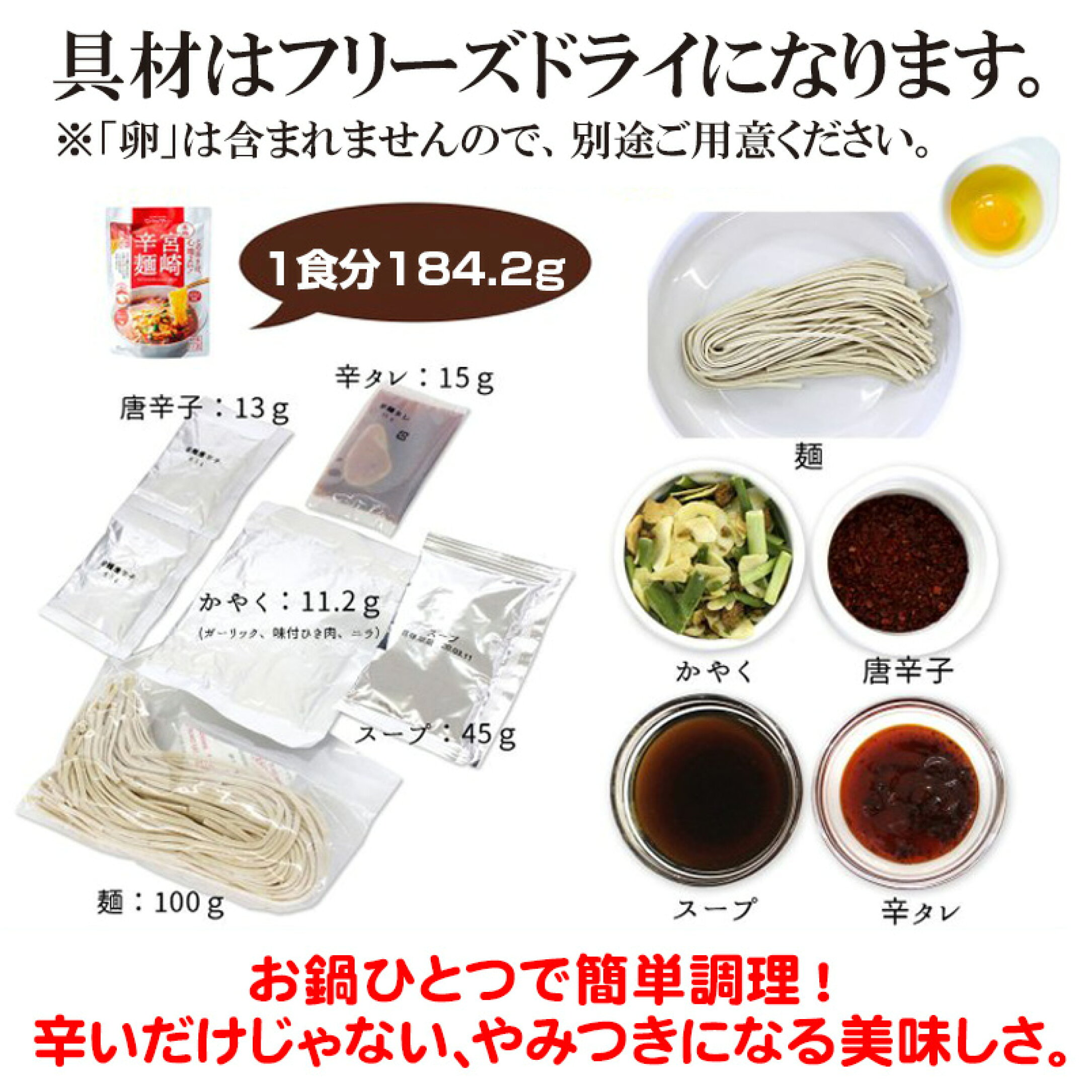 本格宮崎辛麺はもちもち食感のこんにゃく風麺と旨みたっぷりのあご出汁ベースのスープに辛タレ・ひき肉・ニラ・2種類のニンニクで仕上げたインスタントなのにお店以上の味を実現した本格的な辛麺です。 辛い物が好きな人はもちろん、「辛いラーメンてただ辛いだけで味がないよね」と思ってる人、「宮崎に行って辛麺食べてみたいけど忙しくて行けない」という人にもおすすめ!