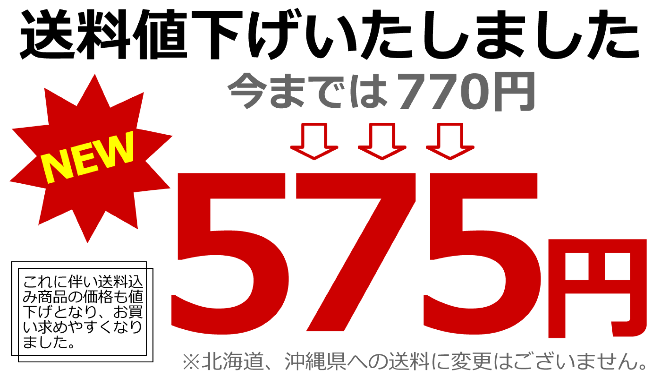 5/21より当店の本州、四国、九州への送料を値下げいたしました。これに伴い送料込み商品の価格も値下げとなり、お買い求めやすくなりました。※北海道、沖縄県への送料の変更はございません。