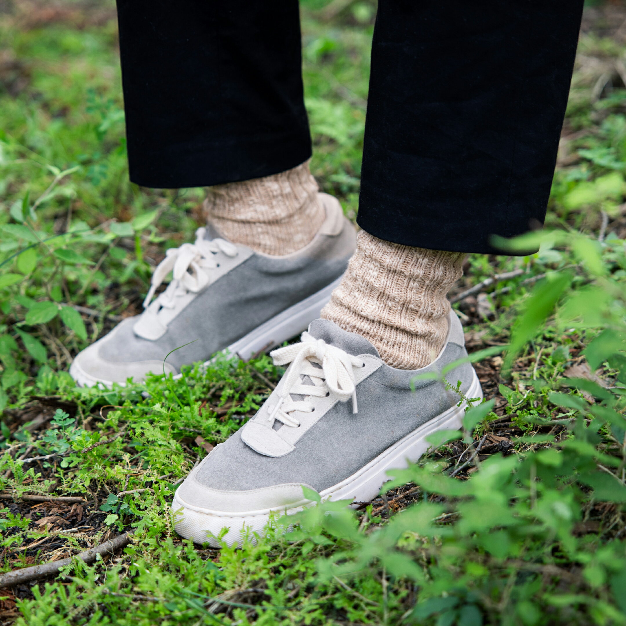 「サステナブル=堅苦しい」ではなく、 日常で気軽に楽しめるカジュアルなソックスを目指して編立ました。 どんな服にも合わせやすい「ベージュ」 差し色になる「レッド」 吉野千本桜をイメージした「サクラ」 もちろんSOUKIの得意なローゲージソックスで仕上げていて、 ぽこぽことしたスラブ糸や、つま先や履き口のラインがSOUKIらしいソックスです。