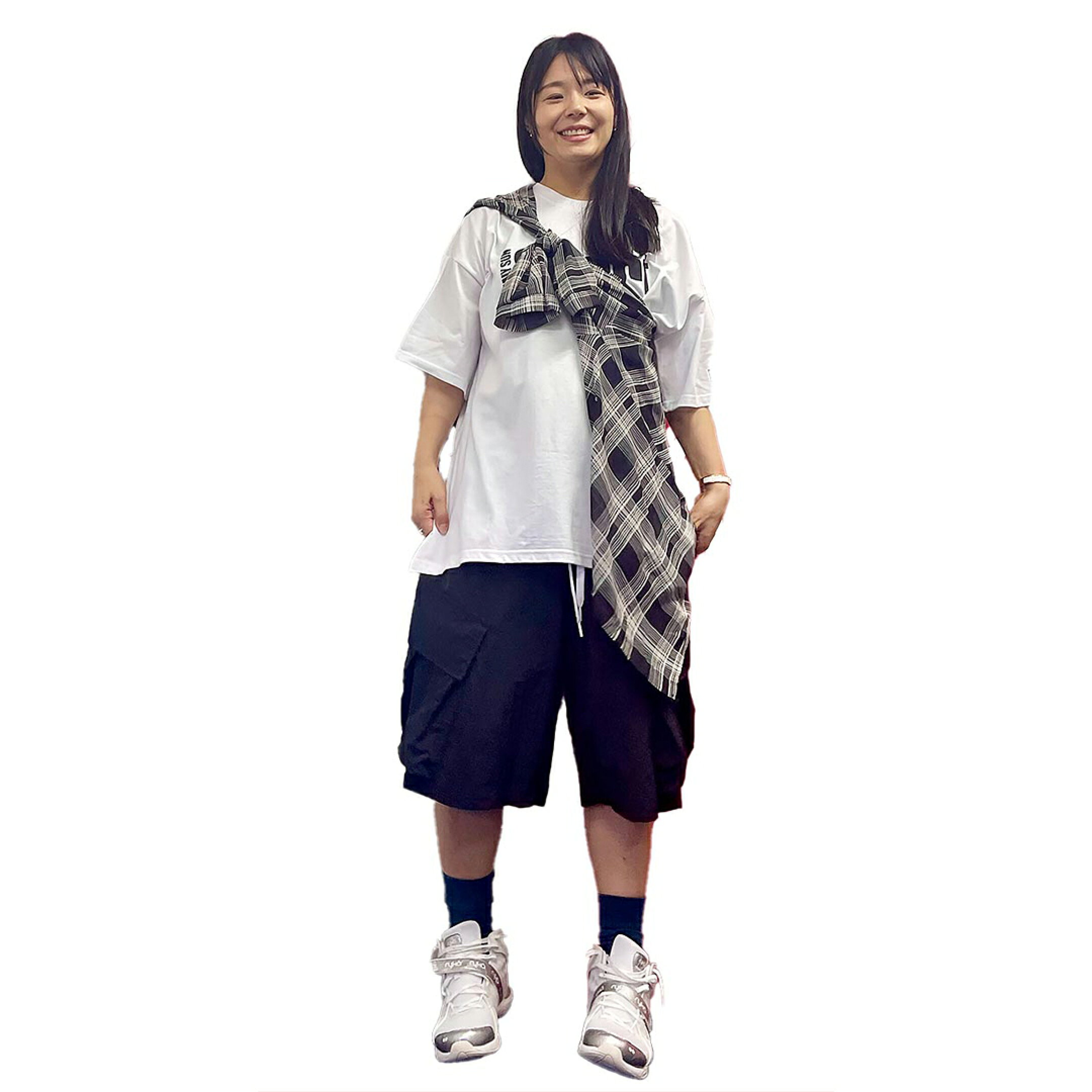 ブラックカーゴパンツは1枚は持っておきたい名品。MIKAもリアルバイするほどお気に入り!オーバーサイズのTシャツとキャップの組み合わせで、カッコよさと親しみやすさを兼ね備えたダンサーコーデに。 【MIKA’s POINT】 1.動きやすい軽さと乾きやすさが◎のパンツ。 2.ゆるずるに合わせた着こなしは大好物! 3.白Tシャツも合うよ!
