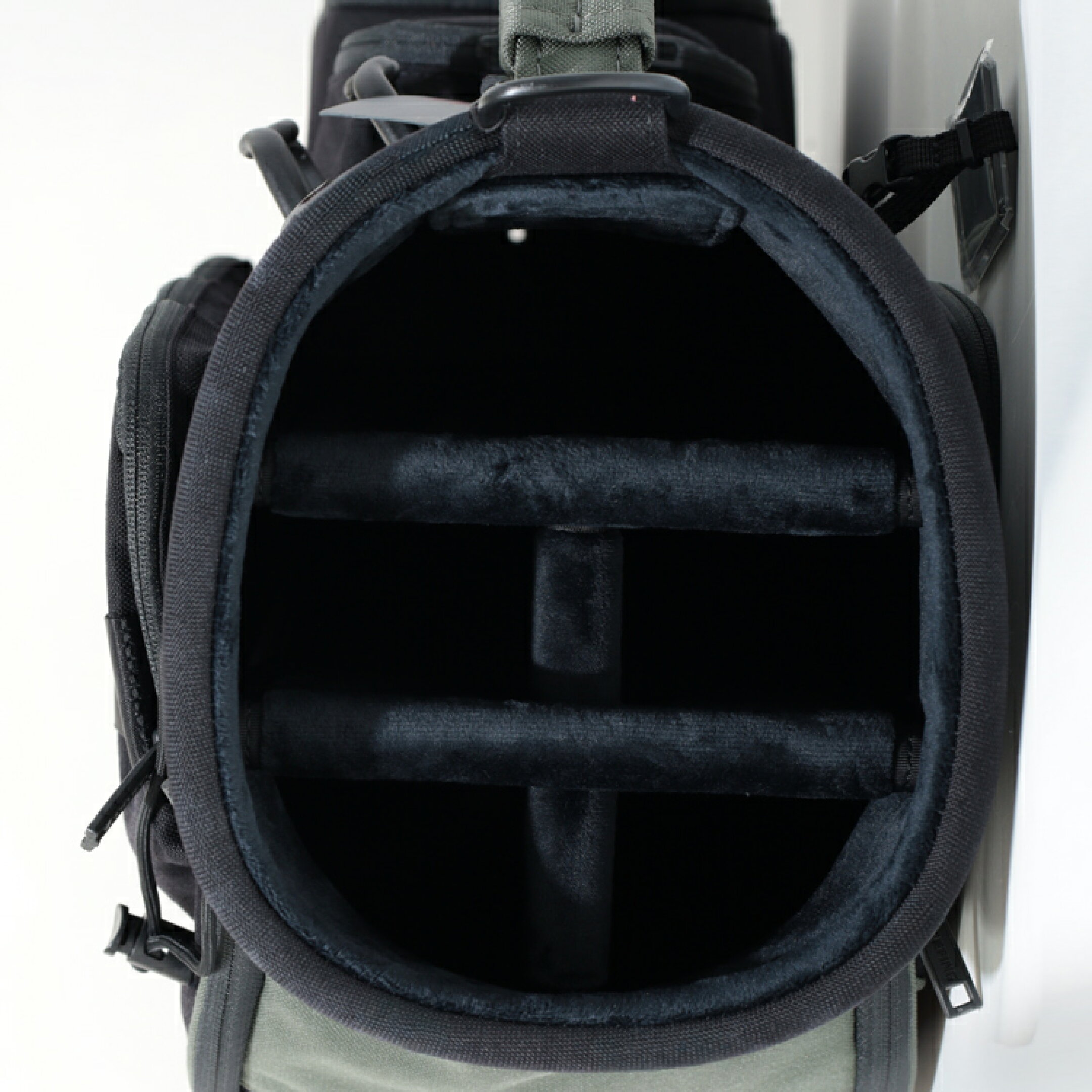 生地を変えて、色を組み合わせた単純な内容ではなく、URBAN MILITARYのコアデザインに忠実である事を念頭に製作された別注キャディバッグになります。 奇をてらったり、単純に色を変えるだけではなく、ブラックを基調としながら、チャコールの差し込みでギア感を強化する事で、展開されているブリーフィングゴルフのアイテムとのコーディネート相性も抜群です。 “ありそうでなかったトーンのミリタリー”感はブラック基調なので“初めてのブリーフィングゴルフの1本”としても取り入れやすい、普遍性と特別感を両立しています。 さり気ないポイントとしてブリーフィングロゴは、斜め綾を用いたTWILL柄の特別仕様のロゴです。市販化されているキャディバッグには制作時には採用されていない点も特別感を演出する、拘りのポイントです。