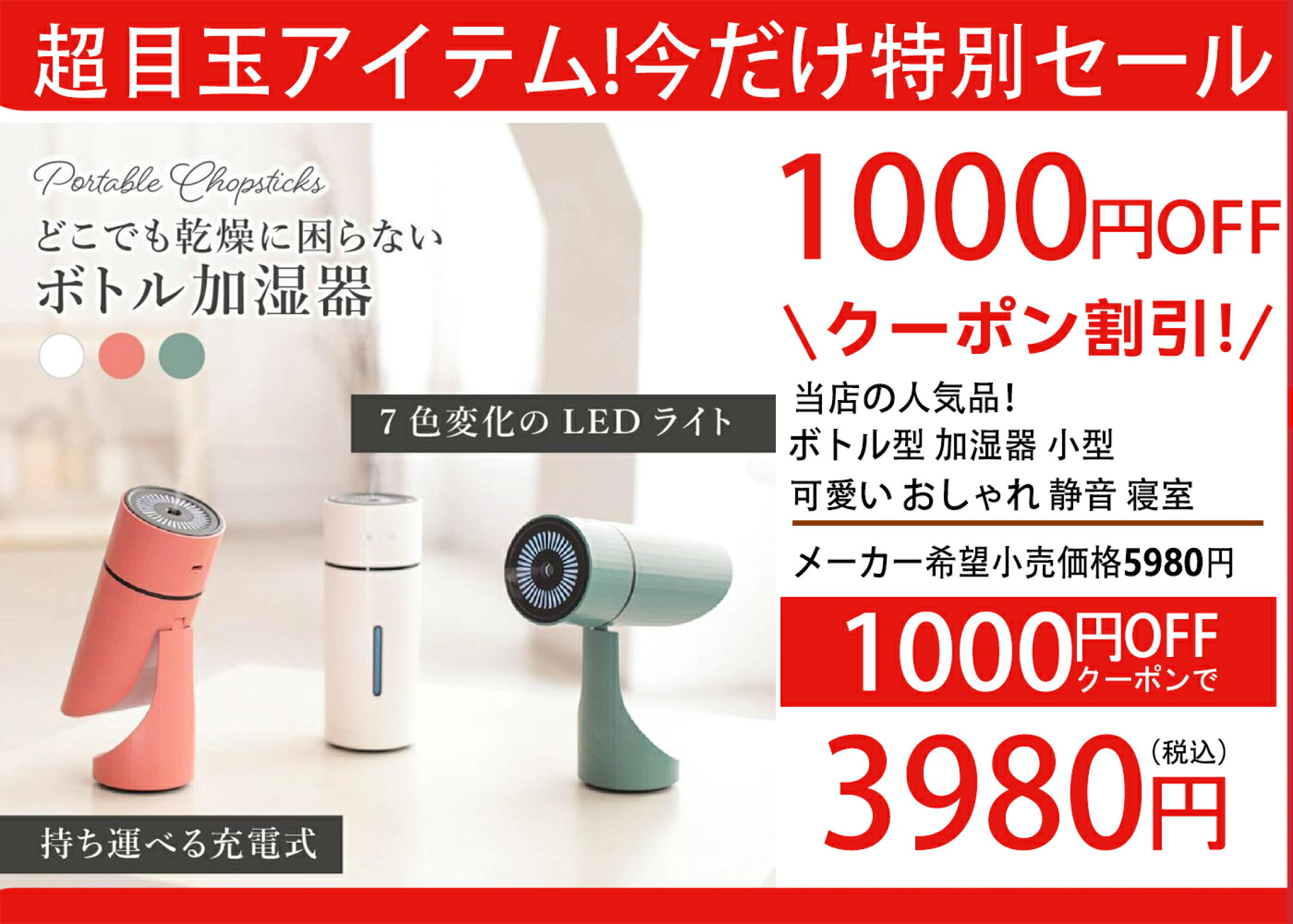加湿器 小型 卓上 超音波加湿器 ミニ おしゃれ USB 3段階加湿 7色LEDライト 軽量 静音 UV除菌 角度調節 大容量 強力 空気清浄 空焚き防止 マイナスイオン 寝室 オフィス 車載 卓上 あすつく
