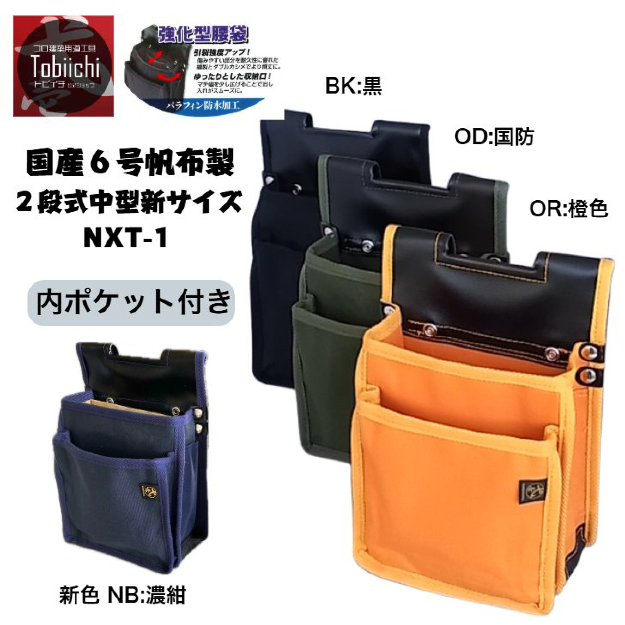 鳶壱 NXT-01 国産6号帆布製 強化型腰袋 中型サイズ 内ポケット付 Y型ハーネス対応 ヨレ止め防止 腰道具 鳶 足場屋 橋梁 鉄骨 建て方 tobiichi トビイチ 日本製 燕三条