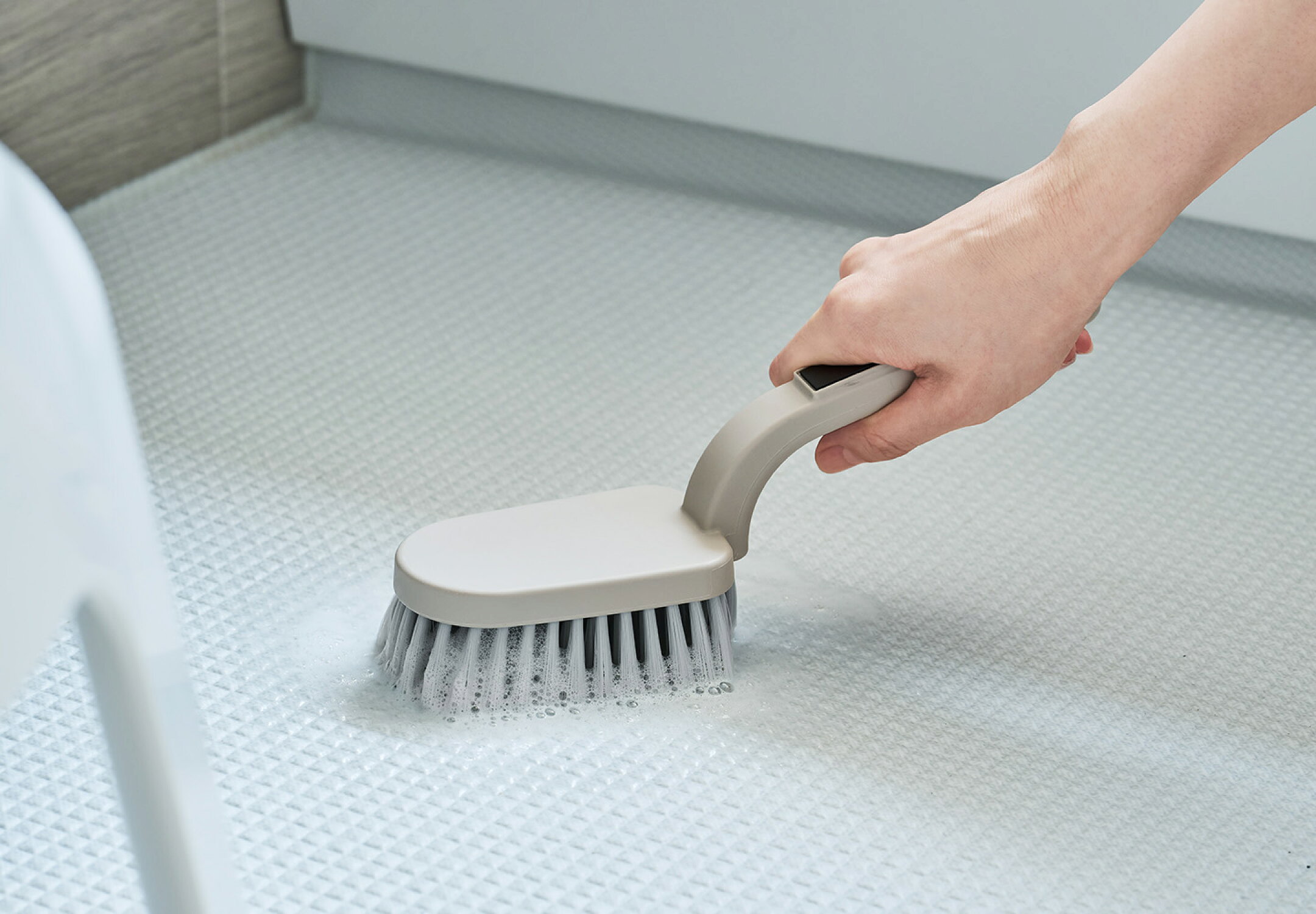 ゴシゴシ掃除に最適! 水切れよく衛生的な マグネット付きのバスブラシ。浮かせて収納できるので、水切れが良く清潔に使うことができます。