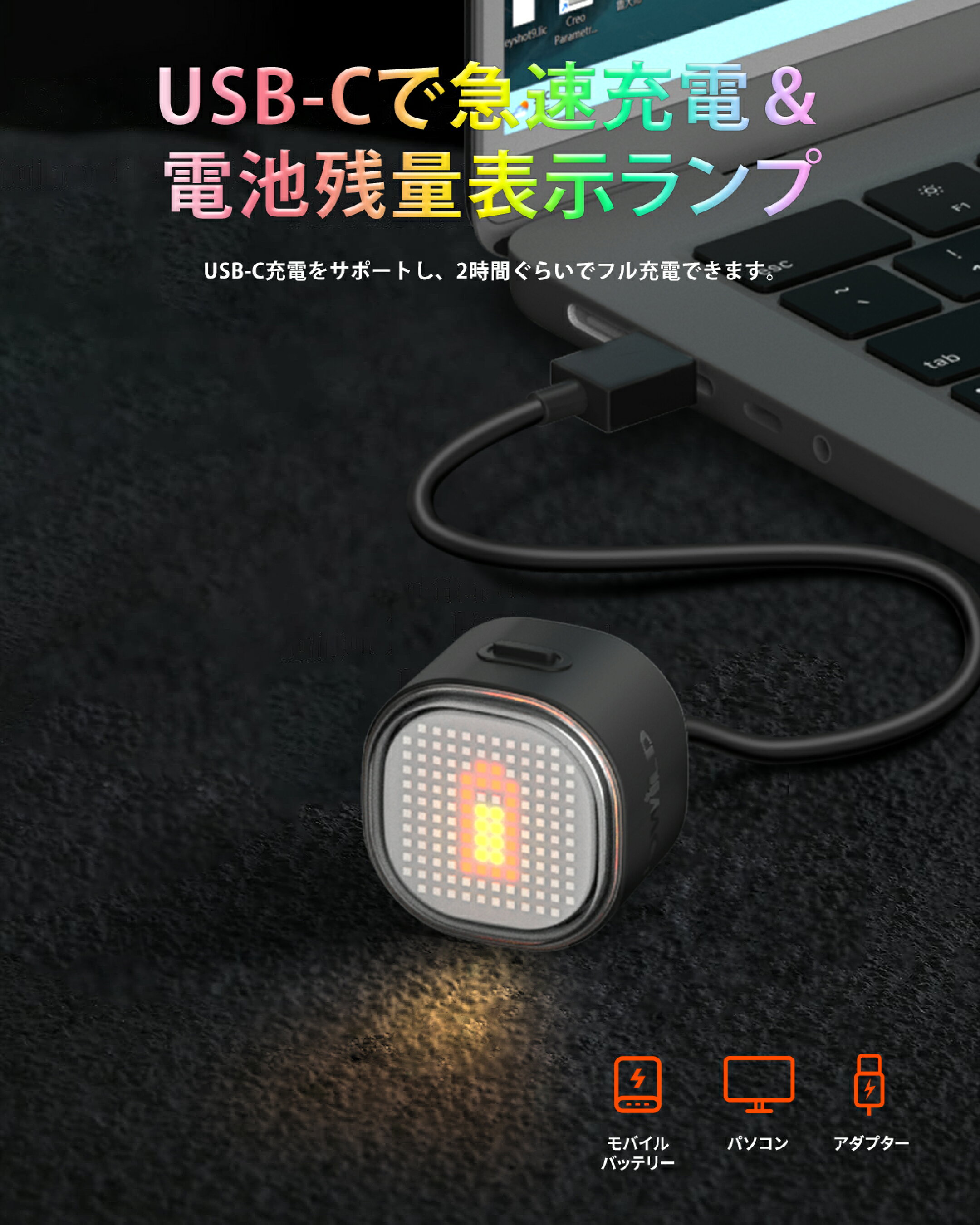 【ブレーキランプON/OFF可能】 自転車 テールライト リアライト 自動点灯/消灯 光センサー 五つの点灯モード IPX6防水 USB-C充電式 自転車テールランプ 軽量 バッテリー残量表示 取付け簡単 昼夜通用 通勤 通学 サイクリング 補助灯 TL03